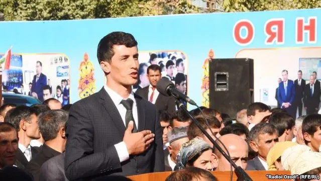 Асроров подошел к микрофону и заявил, что "счастлив" наконец увидеть главу государства собственными глазами. Затем он прочитал написанные в честь главы государства стихи.