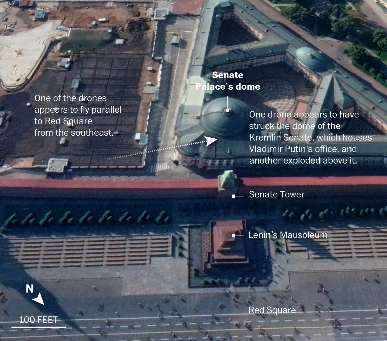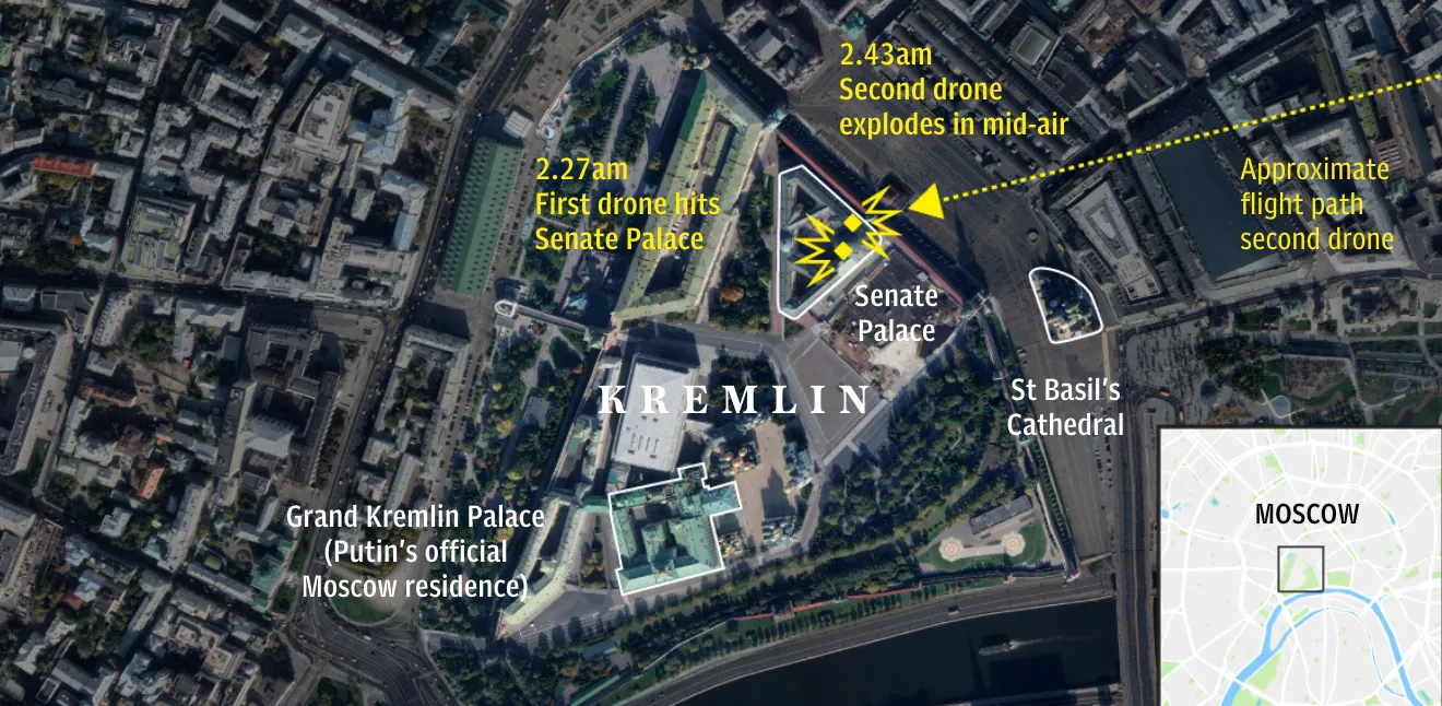 Тот, кто запускал дрон в Кремль, знал, что делает. Траектория полета над российскими символами-иконами поражает – дрон летел над собором Василия Блаженного с характерным лукообразным куполом, затем через всю Красную площадь, над мавзолеем Ленина и стенами Кремля, и, наконец, врезается в одну из крыш за его пределами.
