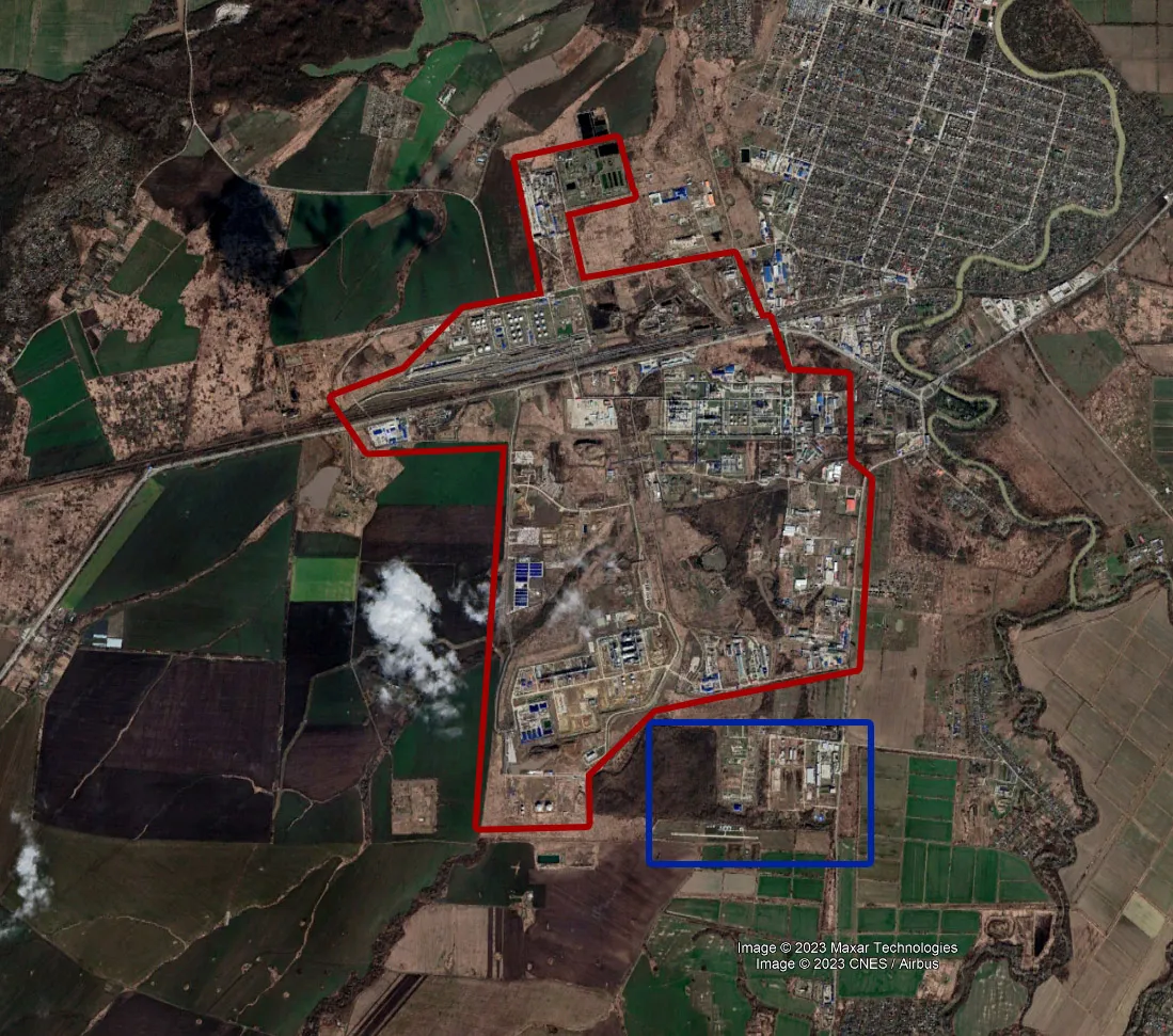 Афипский НПЗ (красным) и позиции 90-й бригады (синим) / Фото Defense Express, снимки Google Earth
