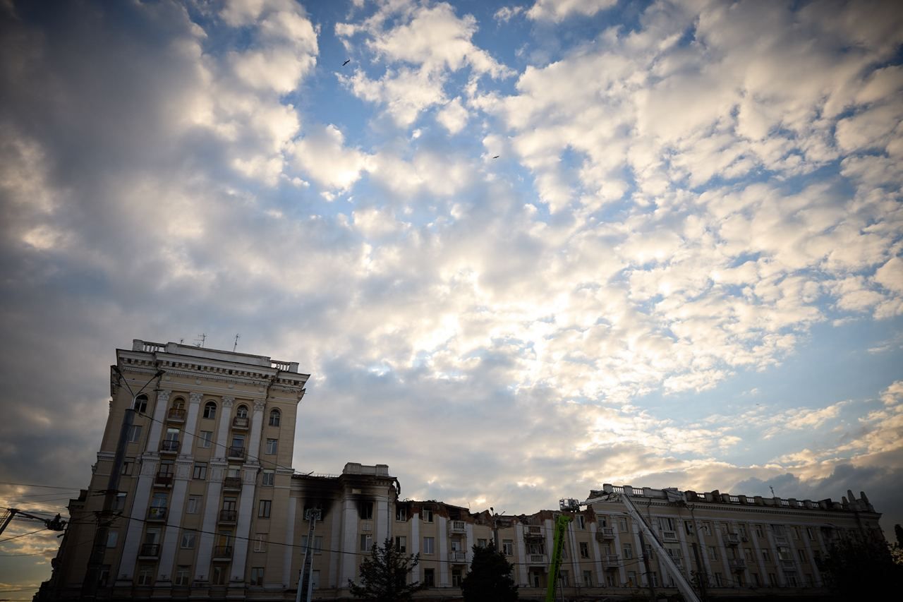 Президент осмотрел пятиэтажное здание, поврежденное в результате ночного массированного ракетного обстрела. Главе государства доложили о ликвидации последствий удара. В доме полностью разрушены два этажа. Также пострадали соседние строения и вокзал.