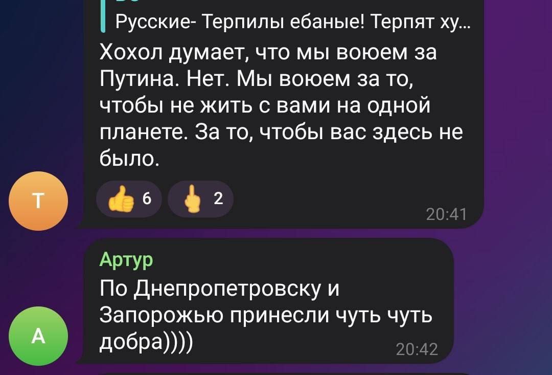 - "Х***ол думает, что мы воюем за Путина. Нет, мы воюем за то, чтобы не жить с вами на одной планете. За то, чтобы вас здесь не было",