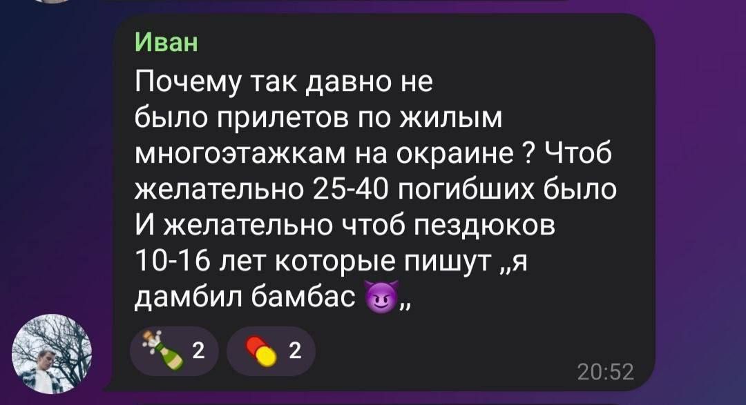 - "Почему так давно не было прилетов по жилым многоэтажкам? Желательно 25 – 40 погибших",