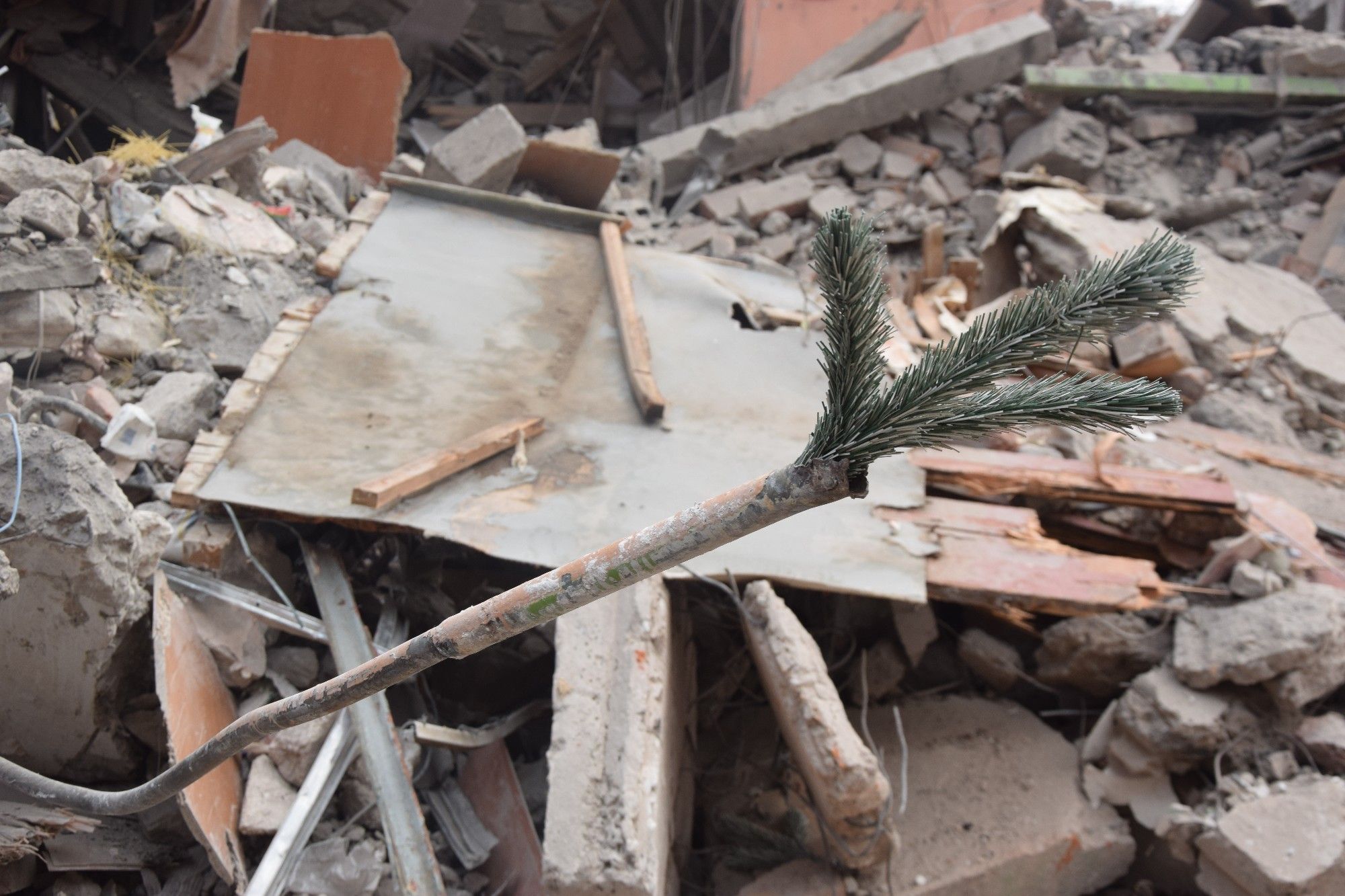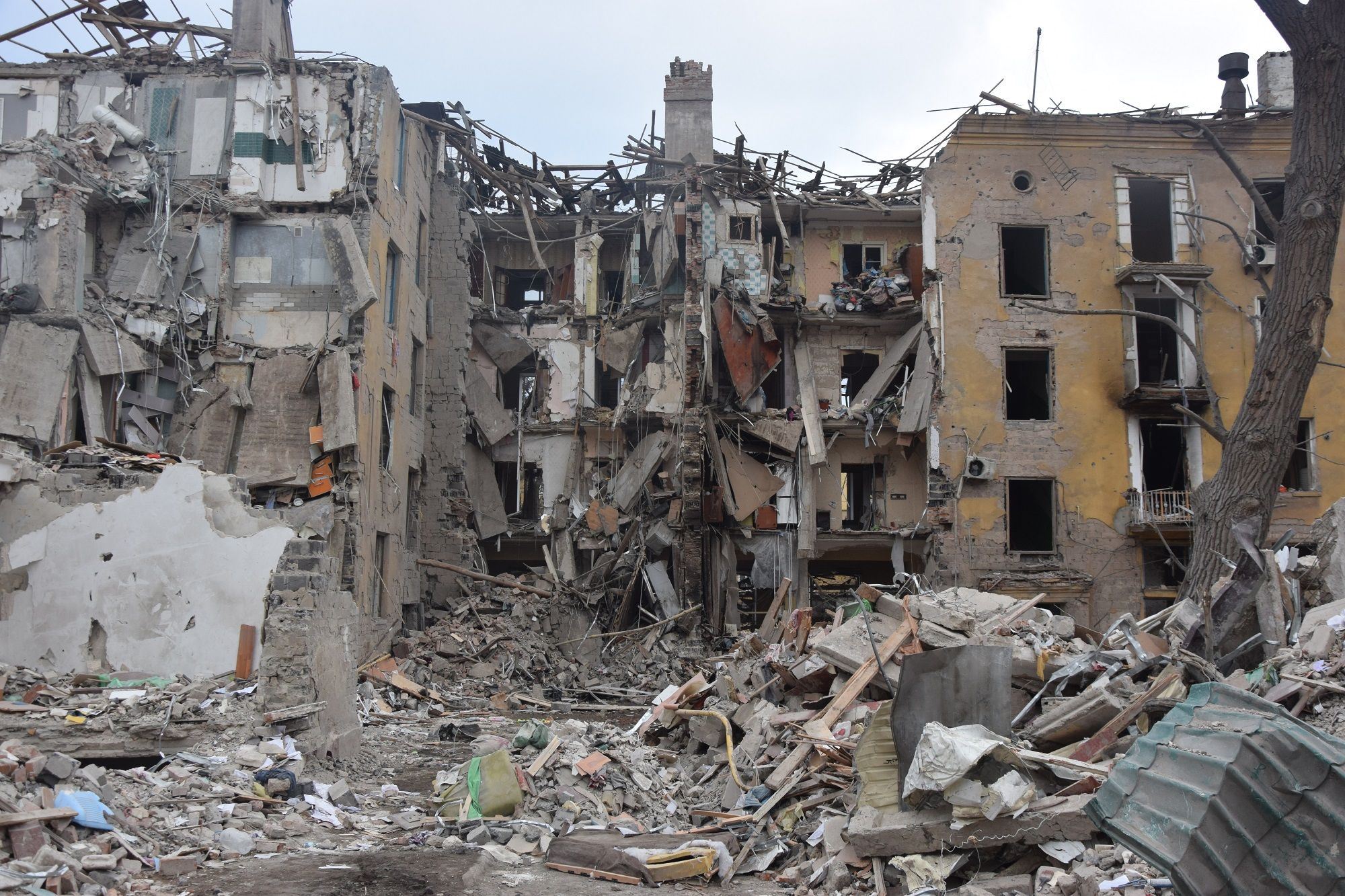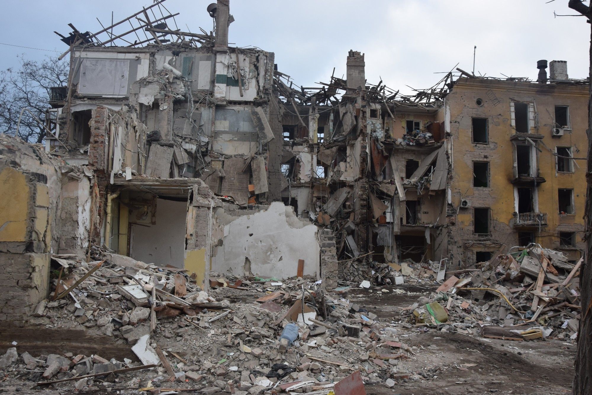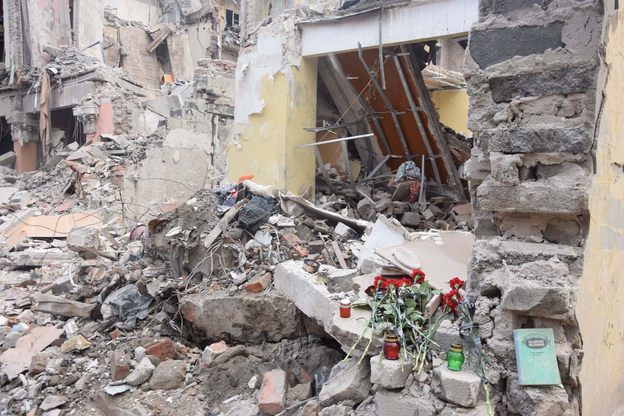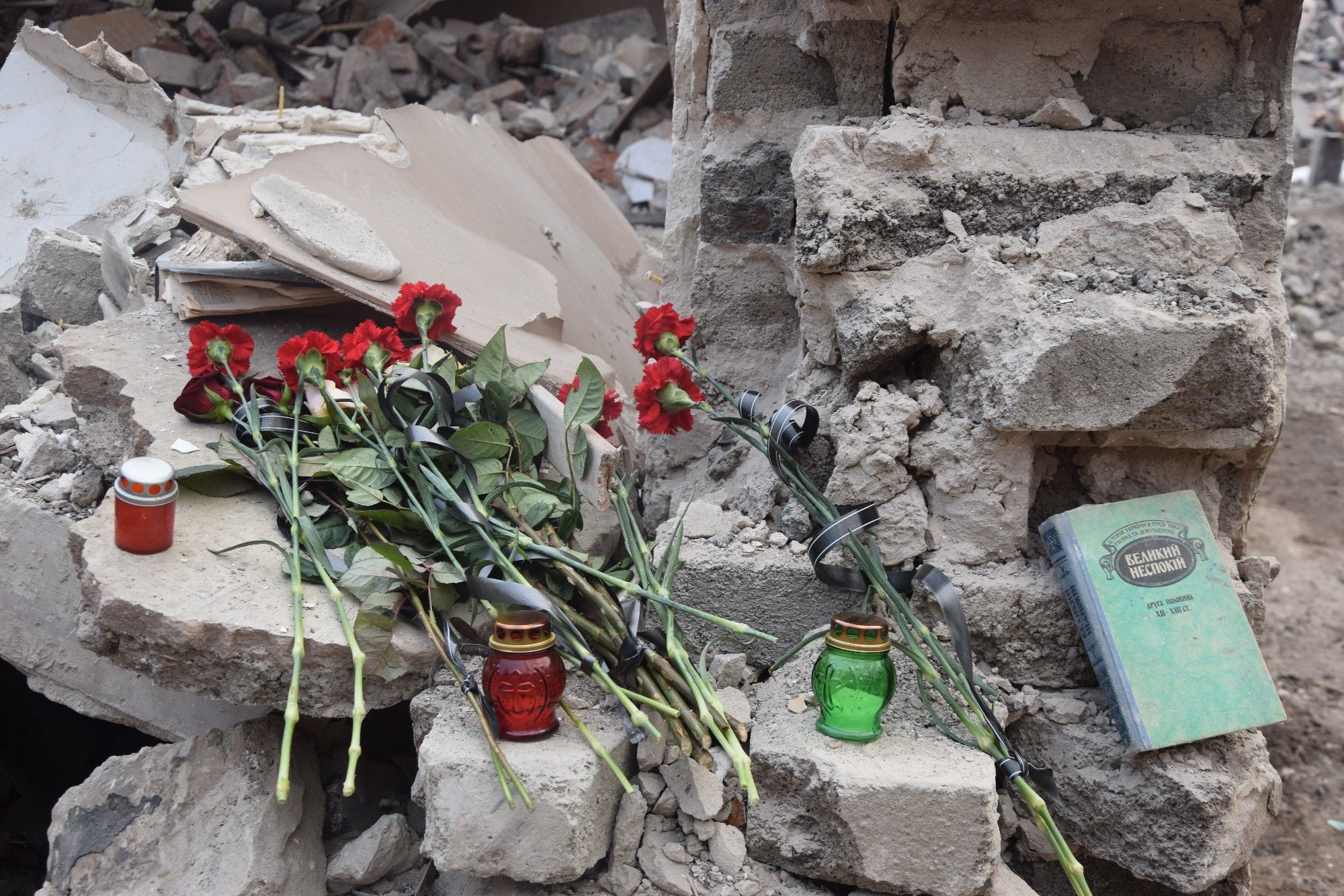В результате попадания четырехэтажный дом почти полностью разрушен. Через несколько дней на руинах здания начали появляться цветы и лампадки, сообщает 24 Канал.