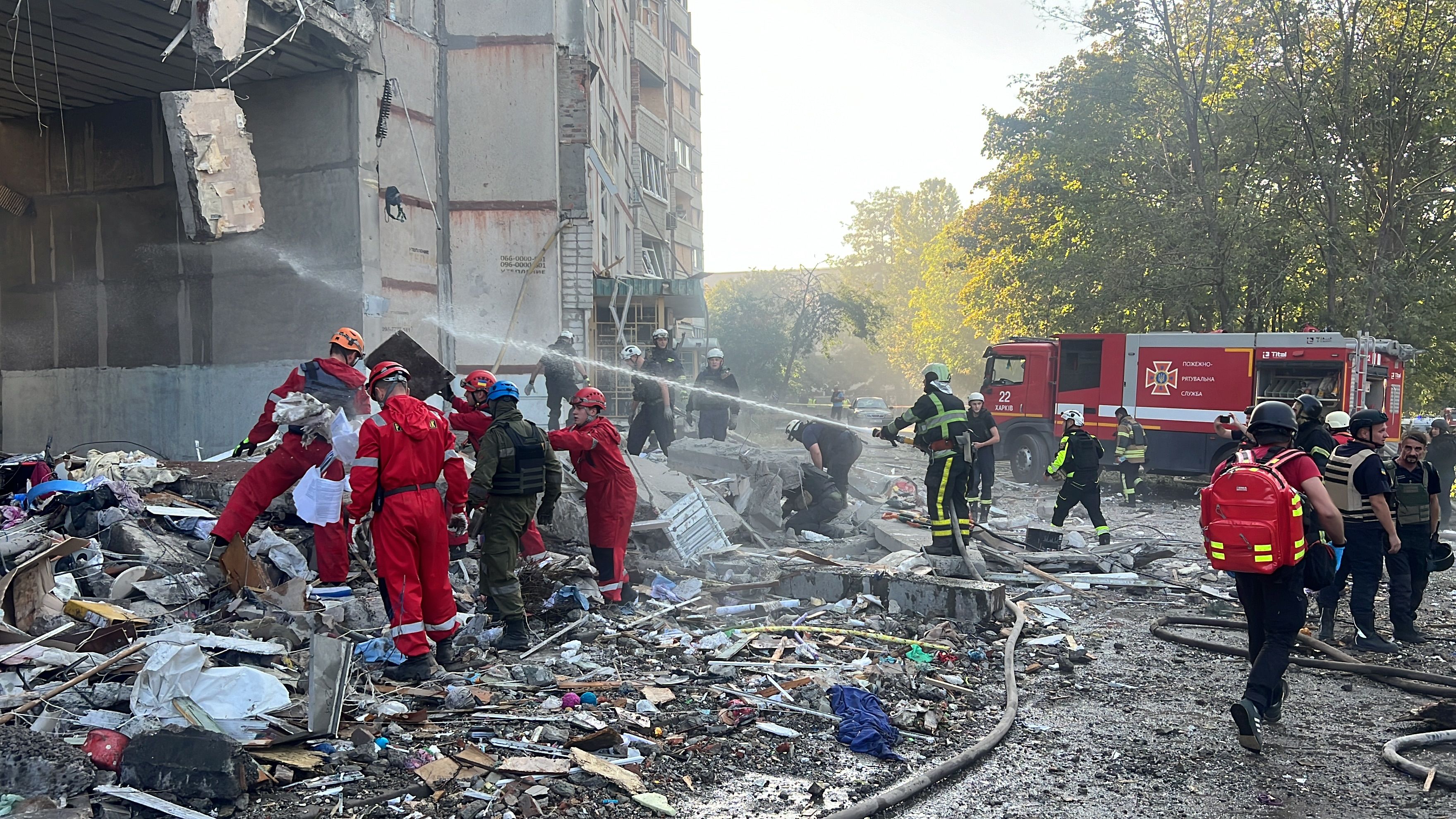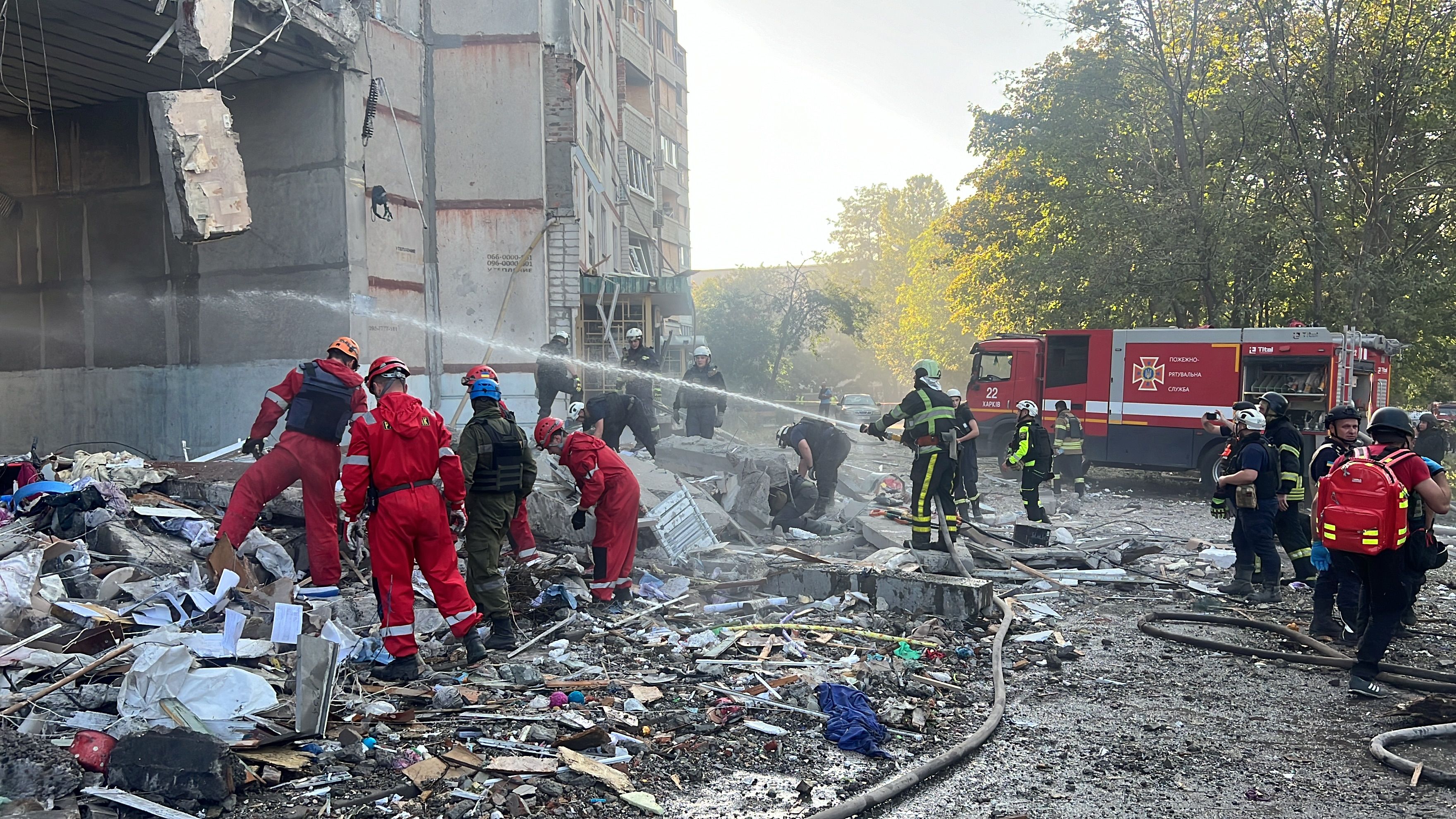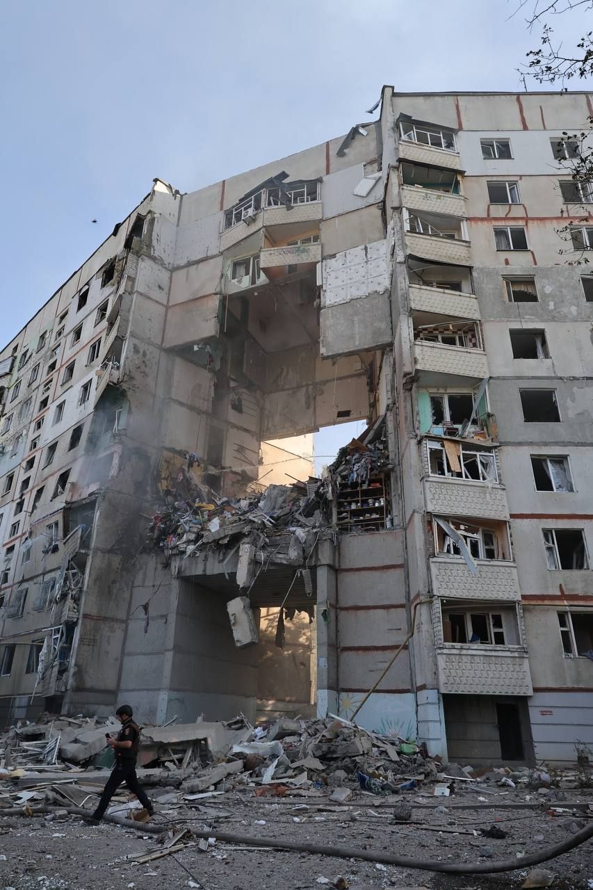 Олег Синегубов рассказал, что оккупанты попали в 9-этажный дом, по гражданскому предприятию, а также на открытой территории. Игорь Терехов уточнил, что в Киевском районе этажи многоэтажки сложились с восьмого по третий.