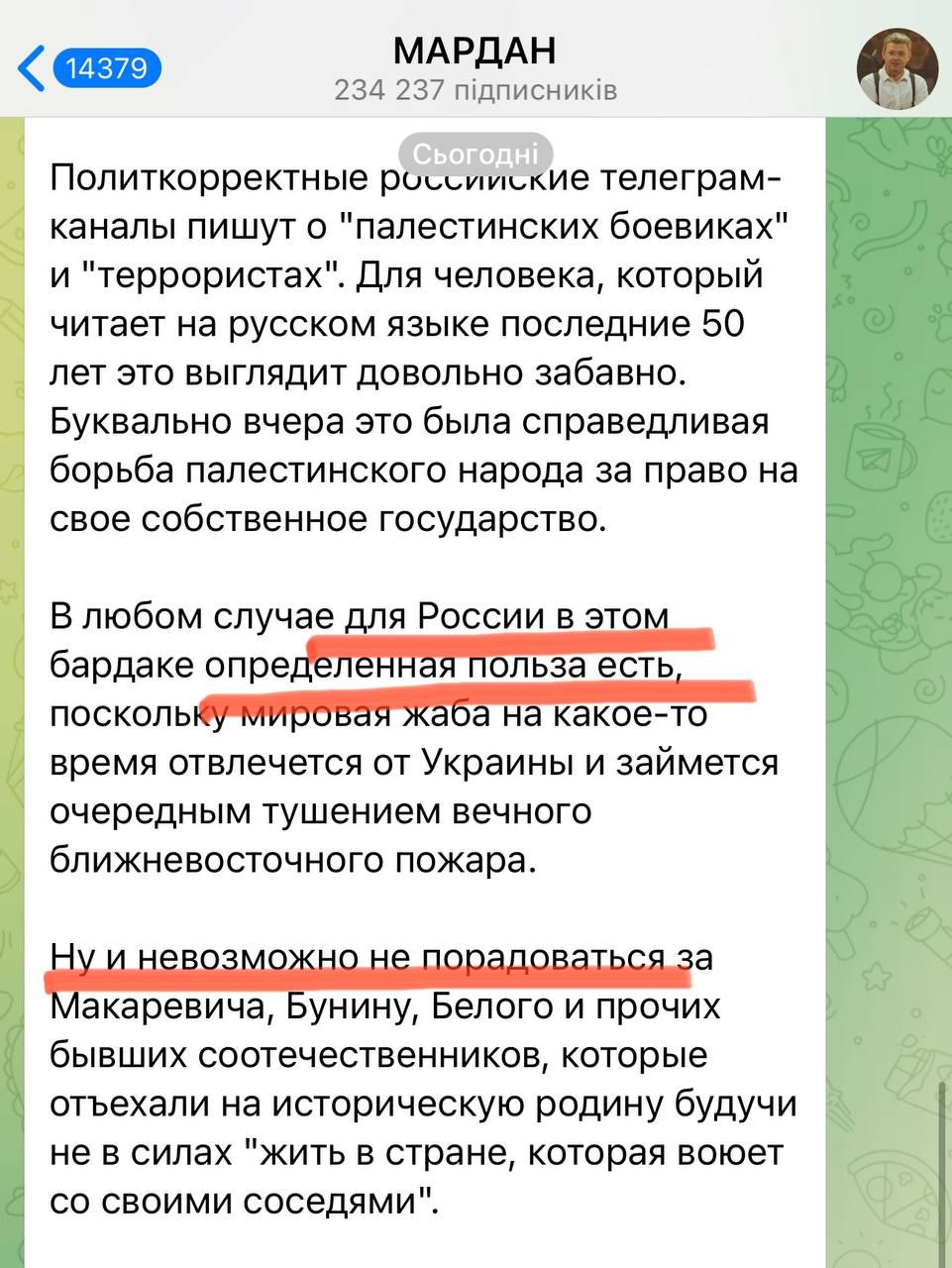 Также российский телеведущий Сергей Мардан отметил, что для России в происходящем "есть польза, которой невозможно не порадоваться". Оккупанты также радуются травмам, которые получили еврейские граждане и полностью поддерживают действия ХАМАС, утверждая, что они "имеют право на это".
