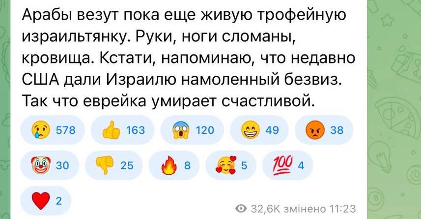 Украинский журналист Дмитрий Казанский подчеркнул, что в российских телеграм-каналах "властвует радость и полный восторг" событиями, произошедшими в Израиле. В частности, пропагандистский "военкор" Дмитрий Стешин пишет, что "не испытывает к расстрелянным женщинам и детям никакой капли жалости и сострадания".
