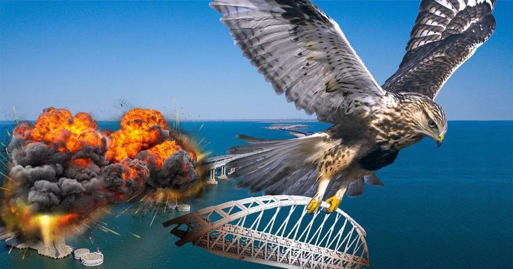 На коллаже птица поднимает в небо уничтоженный Крымский мост / фото с твиттера Данилова