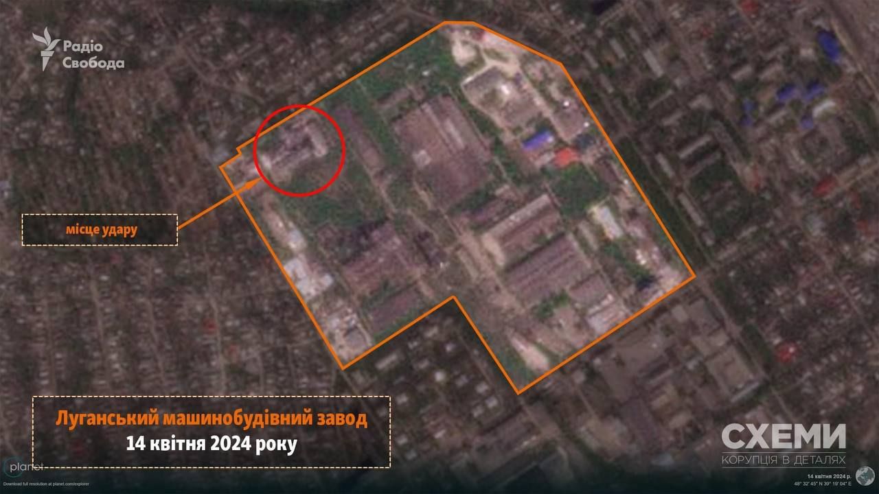 На спутниковых снимках удалось увидеть последствия ударов по "Луганскому машиностроительному заводу-100", который расположен на оккупированной территории. Так, на снимках от 14 апреля заметно, что в результате взрывов пострадало по меньшей мере одно здание.