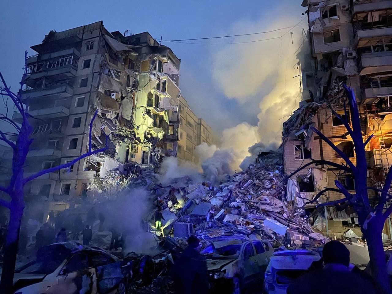 "По данным следствия, днем 14 января в результате ракетной атаки врага на город Днепр произошло попадание в 9 этажный жилой дом. Полностью разрушен подъезд дома. Площадь пожара около 70 квадратных метров. Также произошло возгорание около дома около 15 легковых автомобилей. На месте работают службы ГСЧС", – говорится в сообщении.