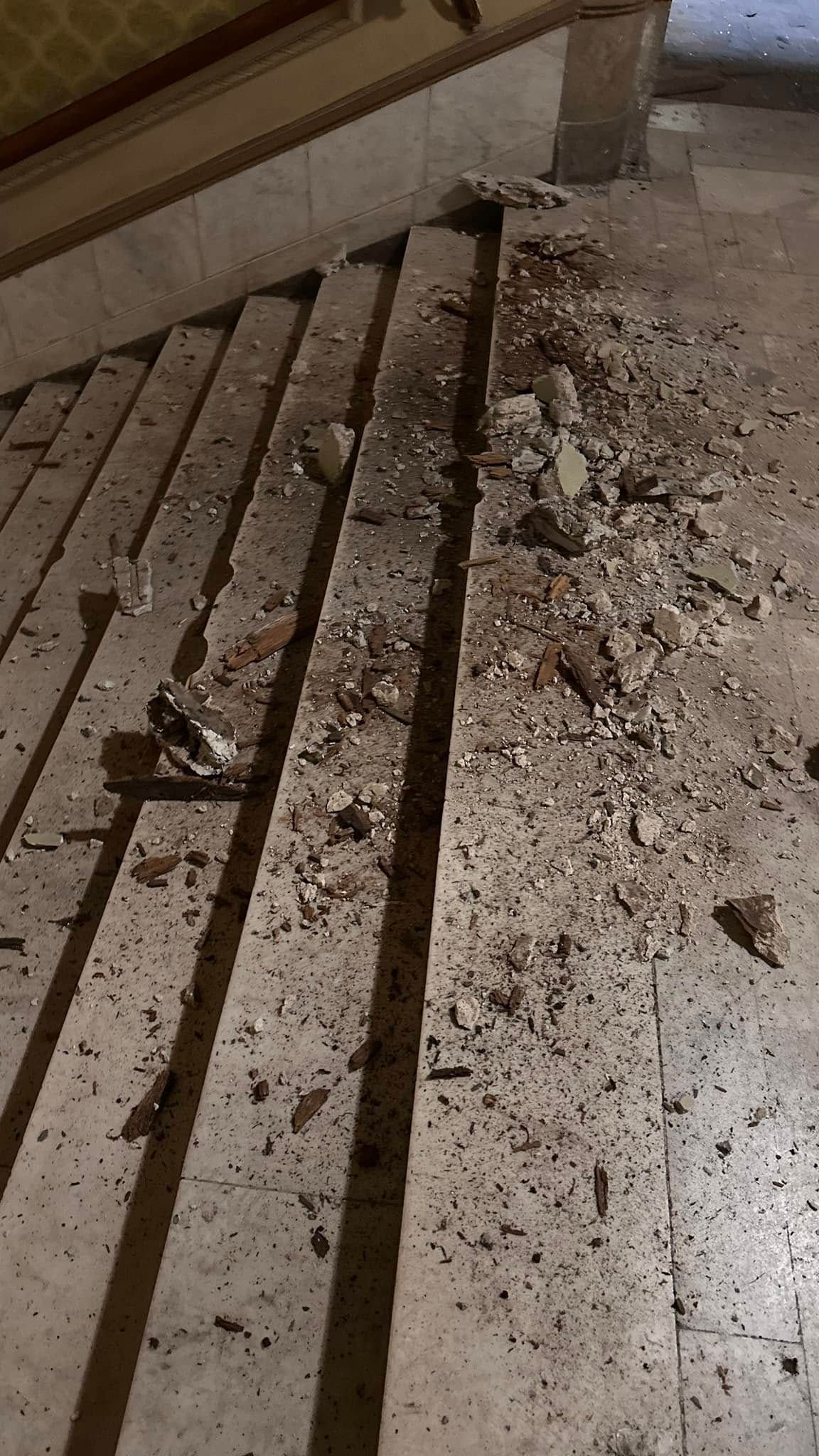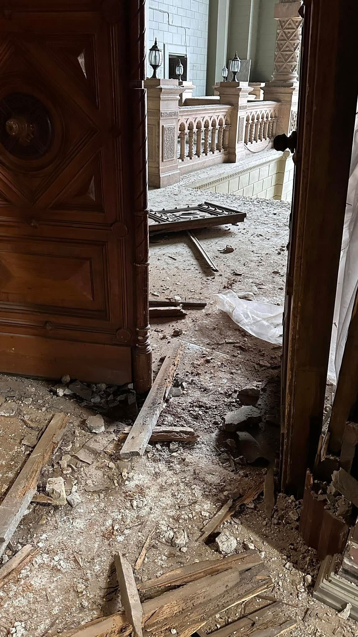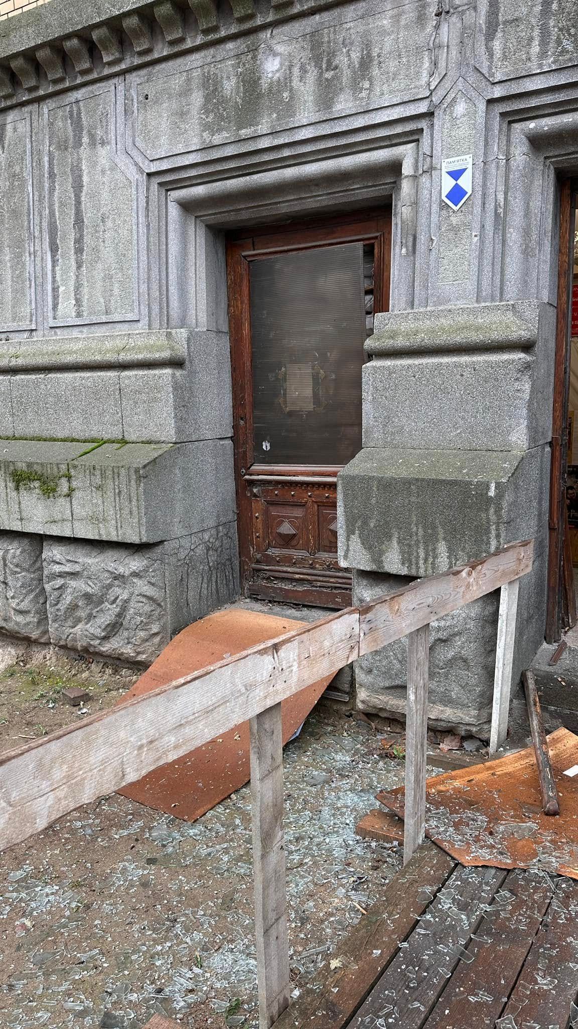 Городской голова рассказал, что взрывная волна выбила аутентичное столярное заполнение главного парадного входа, повредила витражи и внутреннюю отделку помещений.