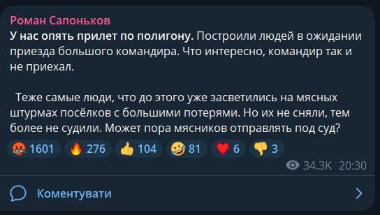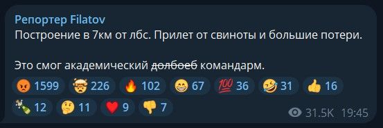 Российский так называемый “военкор” Филатов сообщает, что российский командарм устроил построение в 7 километрах от линии фронта. По его словам, ВСУ нанесли удар по этому скоплению войск. Филатов жалуется, что оккупанты понесли большие потери.