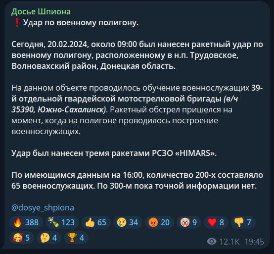 На данном объекте проводилось обучение военнослужащих 39-й отдельной гвардейской мотострелковой бригады (в/ч 35390, Южно-Сахалинск). Ракетный обстрел пришелся на момент, когда на полигоне проводилось построение военнослужащих,