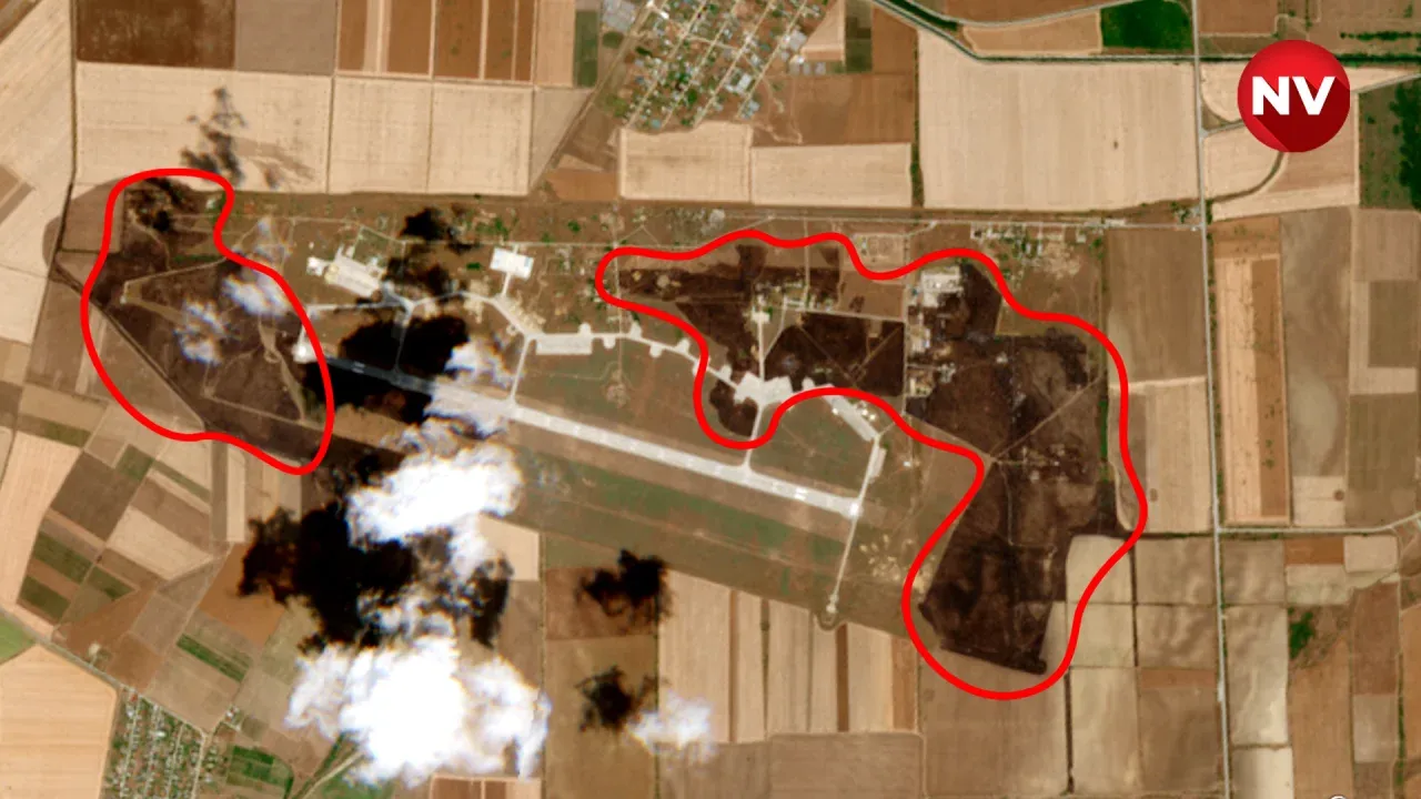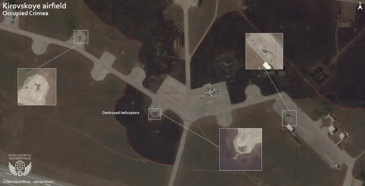 Спутниковые фото от NV подтверждают, что пожары были на точках стоянки вертолетов и на двух точках систем ПВО. Также заметны незначительные повреждения инфраструктуры "Кировского", некоторых зданий на территории.