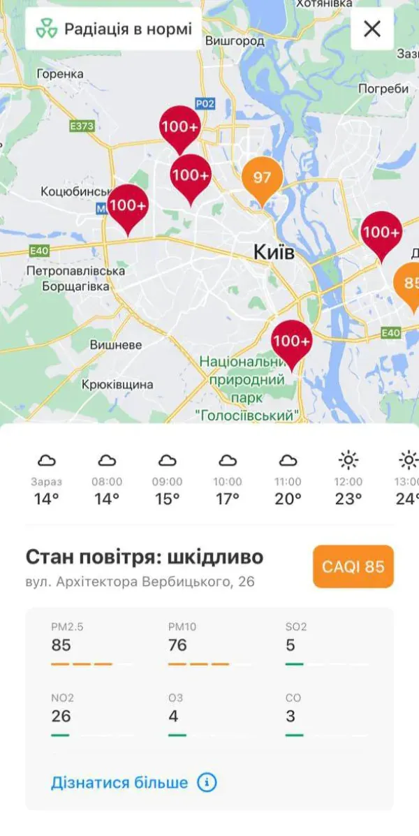 На стационарном пункте мониторинга атмосферного воздуха по адресу улица Китаевская, 22 общий индекс качества воздуха – 34 (низкий уровень загрязненности).
