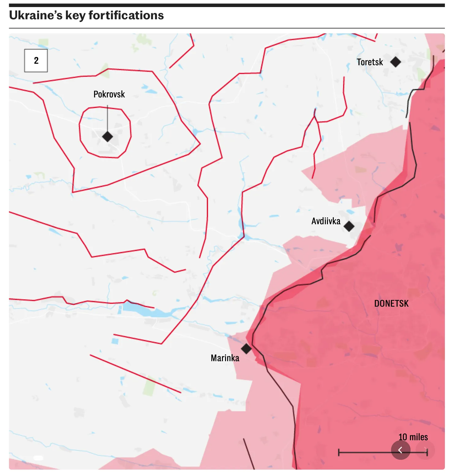 Журналисты пишут, что у Авдеевки, которую пытаются захватить россияне, расположена основная линия обороны. Здесь же наше войско использует ряд природных барьеров в виде озер и рек. Далее следует Покровск, защищенный двухслойной системой траншей, раскинувшихся вокруг города.