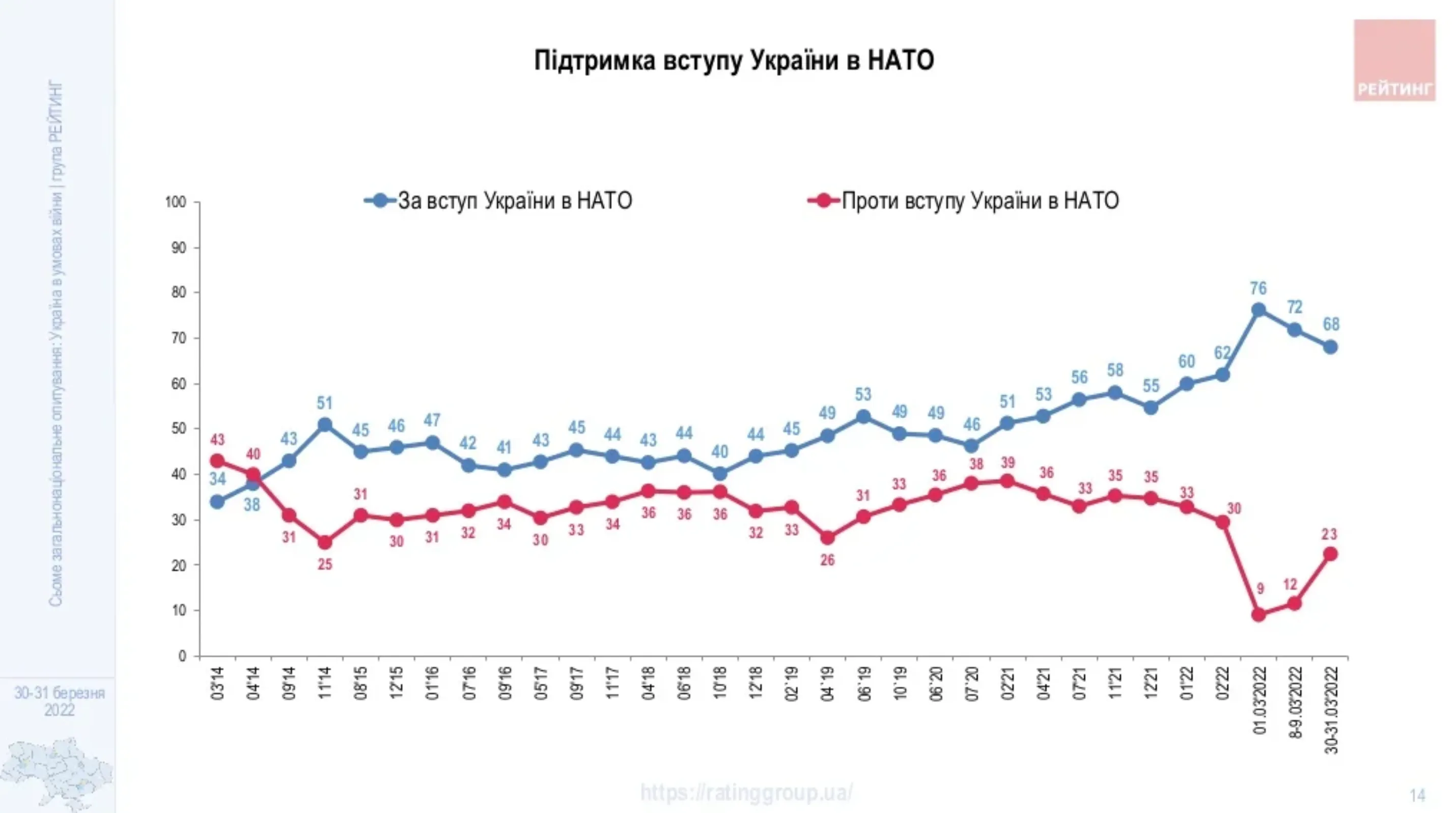 Известно, что в первые дни войны поддержка вхождения Украины в Альянс выросла с 62% до 76%, в первую неделю поддержка уменьшилась до 72%.