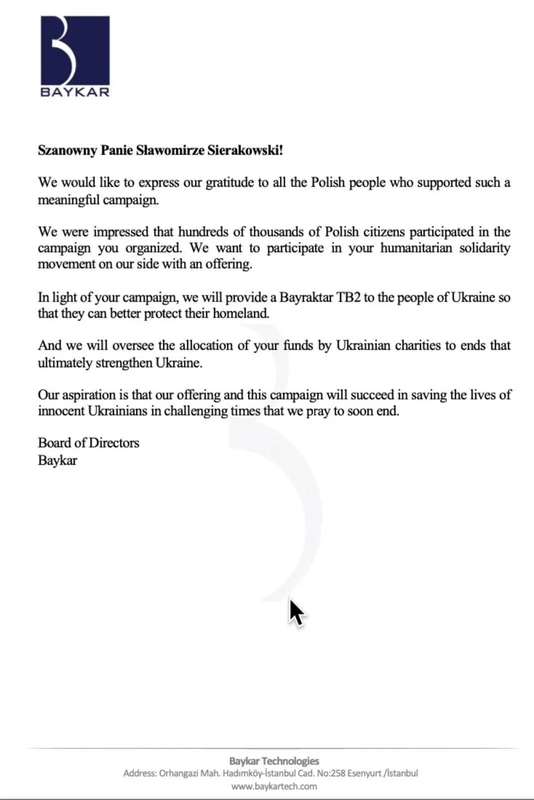 Письмо от компании Baykar организатору сбора / Фото Славомир Сераковский