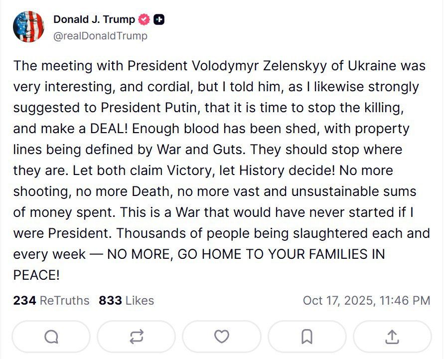 Дональд Трамп призвал Украину и Россию остановиться на нынешней линии фронта / Скриншот с аккаунта президента США в соцсети Х