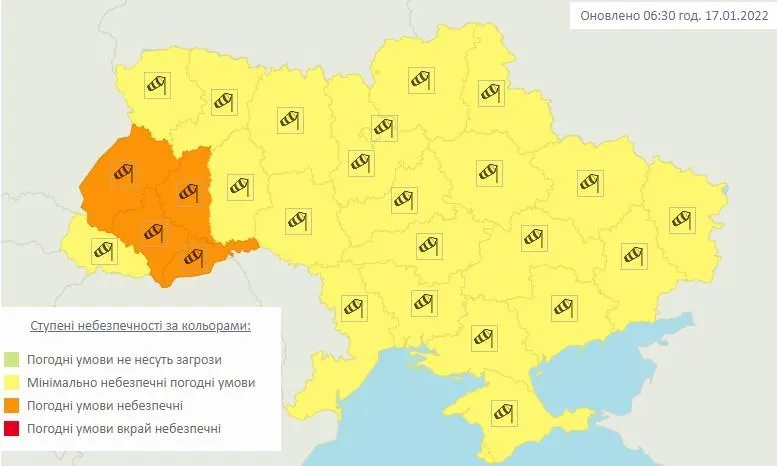 Днем 17 января в Украине порывы ветра 17 – 22 метров в секунду, (И уровень опасности, желтый), во Львовской, Тернопольской, Ивано-Франковской и Черновицкой областях 25 – 30 метров в секунду (II уровень опасности, оранжевый),
