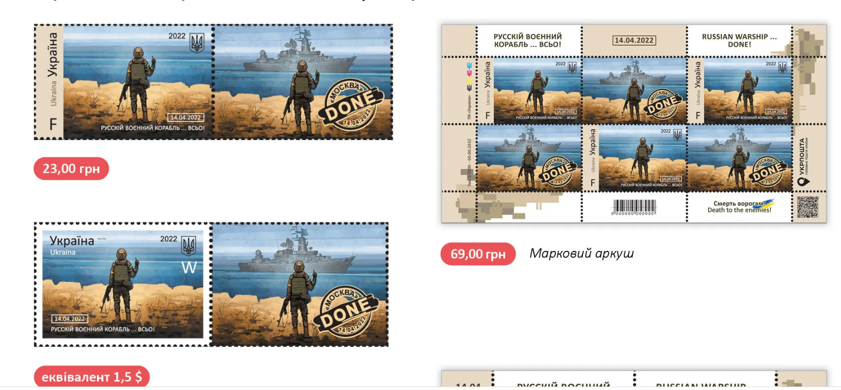 В компании сообщили, что 23 мая, в День морской пехоты Украины, а также на 40 день после трагической гибели российского крейсера "Москва", Укрпочта выпустит марку "Русскій воєнний корабль … всьо".