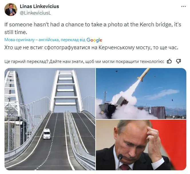 Посол Литвы Линас Линкявичюс в соцсети Х удачно потролил российских граждан, намекнув на падение Крымского моста.