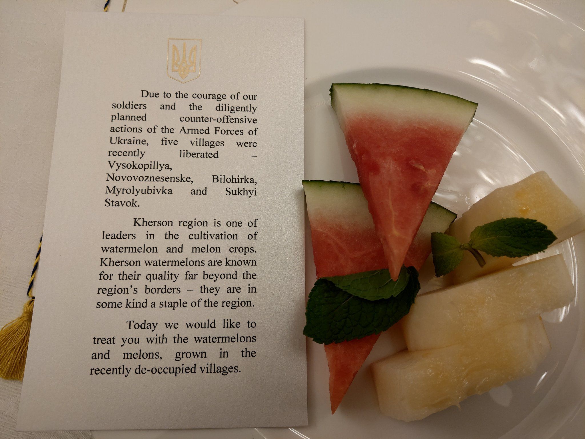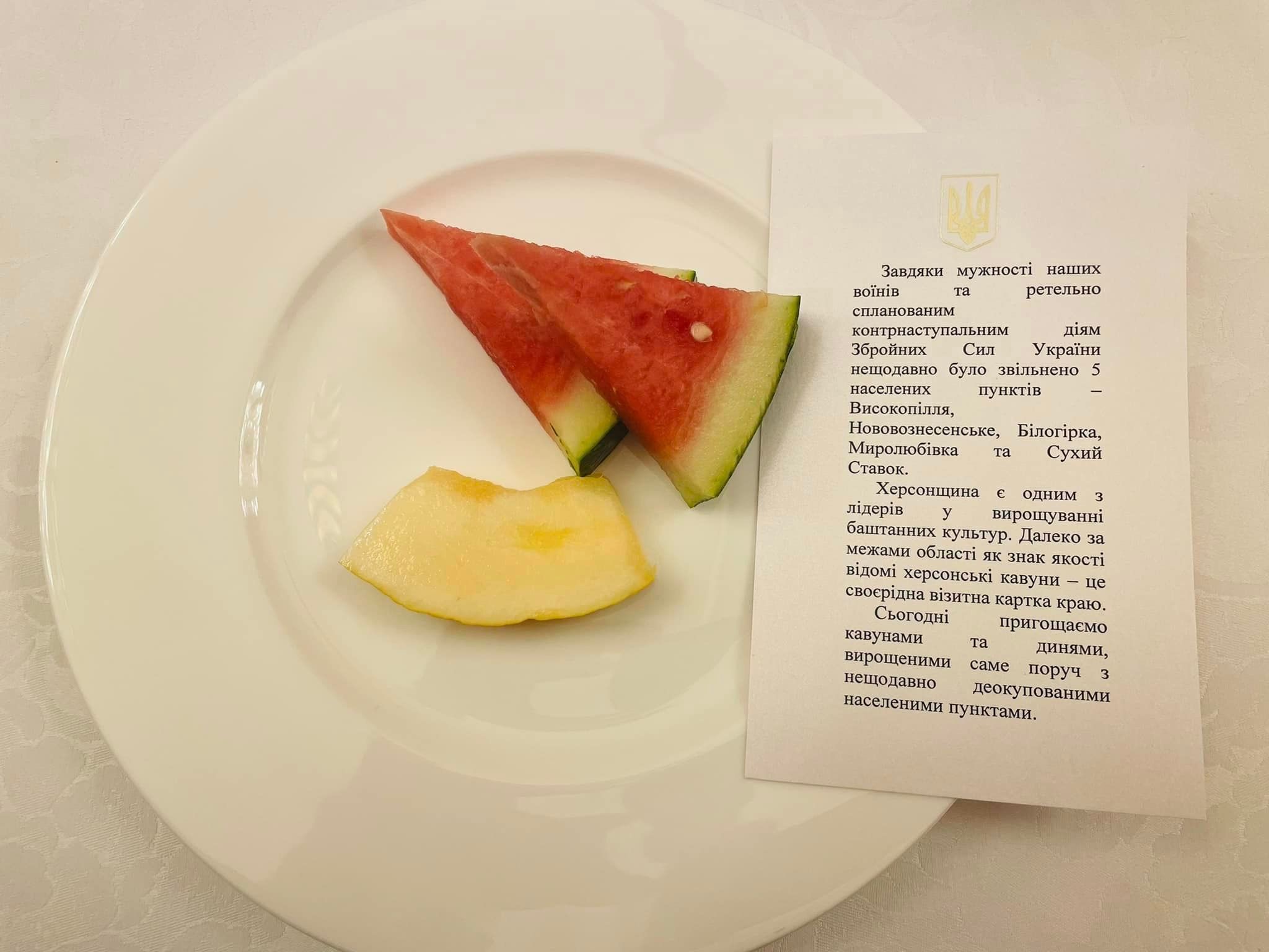 Затем заместитель руководителя Офиса Президента Украины Андрей Сибига написал, что именно дыней и арбузом из недавно деоккупированных украинских земель угощали европейскую делегацию во главе с президентом Еврокомиссии Урсулой фон дер Ляйен во время рабочего обеда от имени президента Украины.