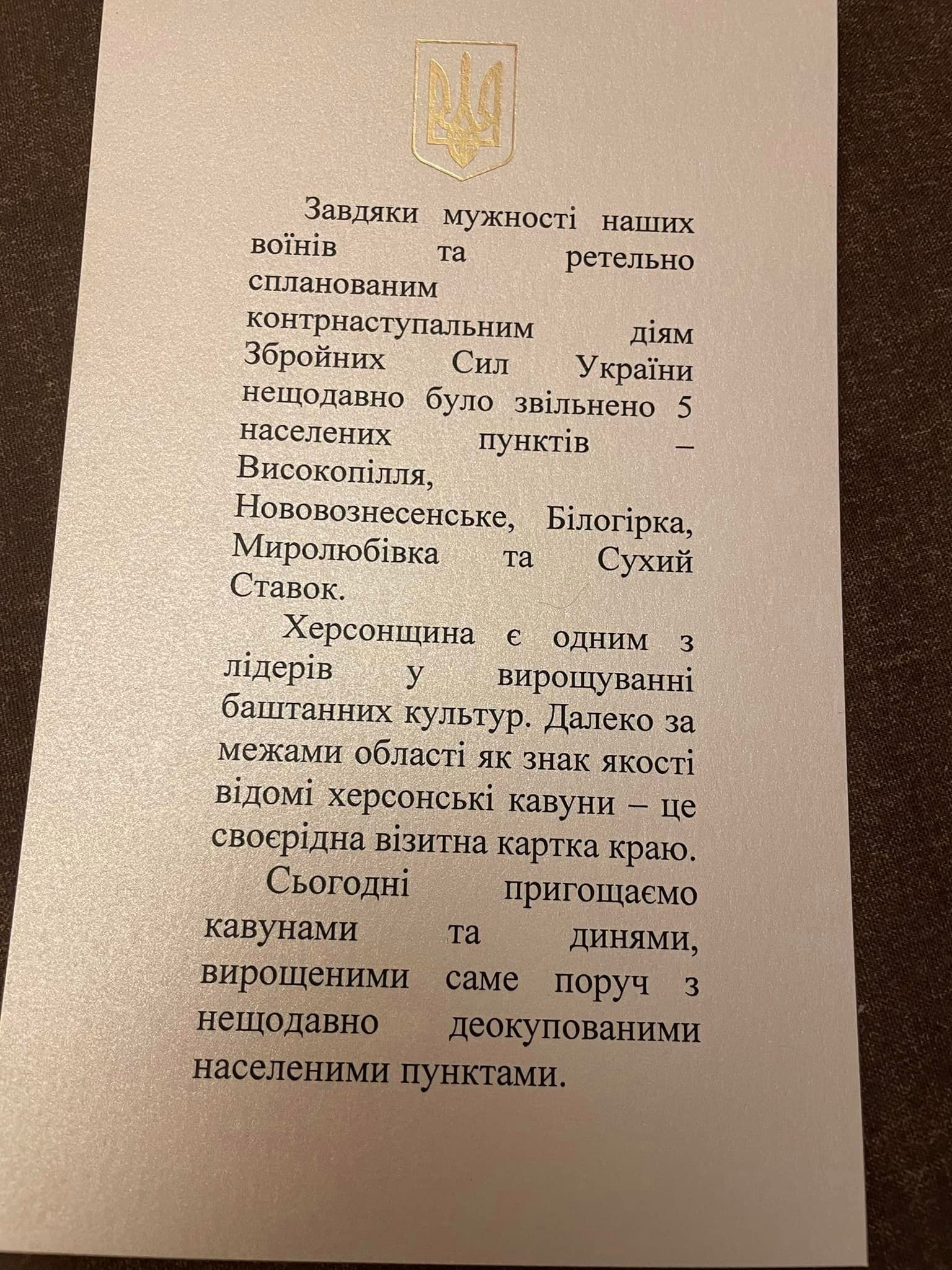 Он также опубликовал фото, на котором видна открытка с надписью: "Херсонские арбузы известны своим качеством далеко за пределами области – они в определенной степени основным продуктом региона. Сегодня хотим угостить вас арбузами и дынями, выращенными в недавно деоккупированных селах".