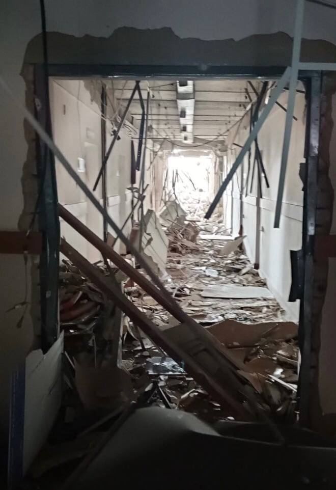 Местные власти рассказали, что в результате удара полностью уничтожен четвертый этаж, еще один – частично. Также вражеским огнем повреждены машины скорой помощи.