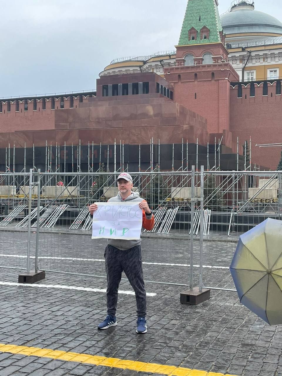 Крюков вышел в центр Москвы с плакатом "Христос за мир". Долго его акция не продолжалась – его задержали и доставили в управление, где будут объяснять основы религиозного воспитания России.