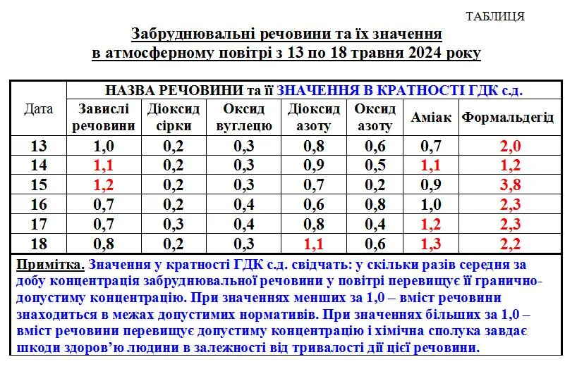 - формальдегид: в 1,2 – 3,8 раза (с 13 по 18 мая) по улице Гетмана Сагайдачного в Днепровском микрорайоне;