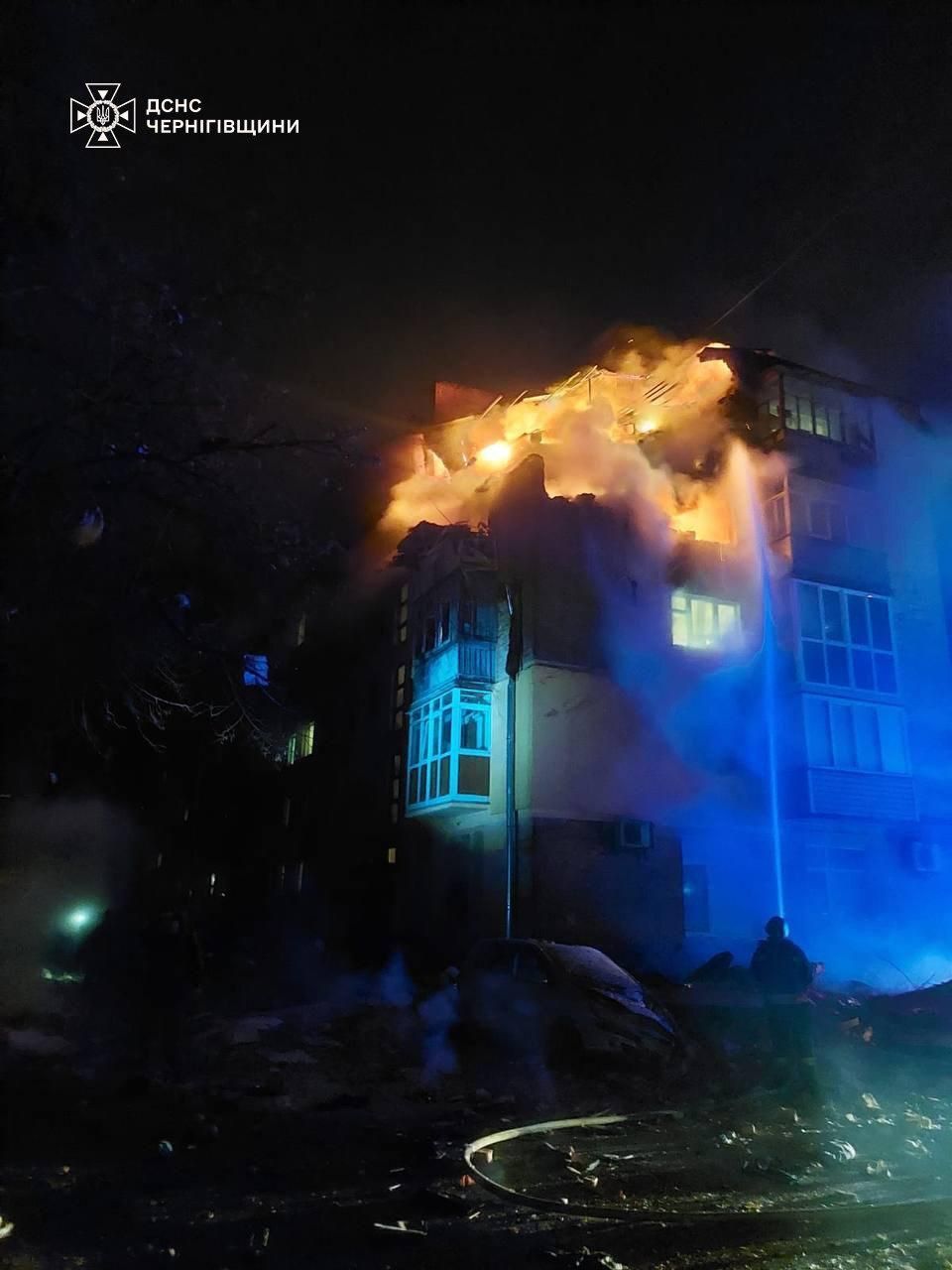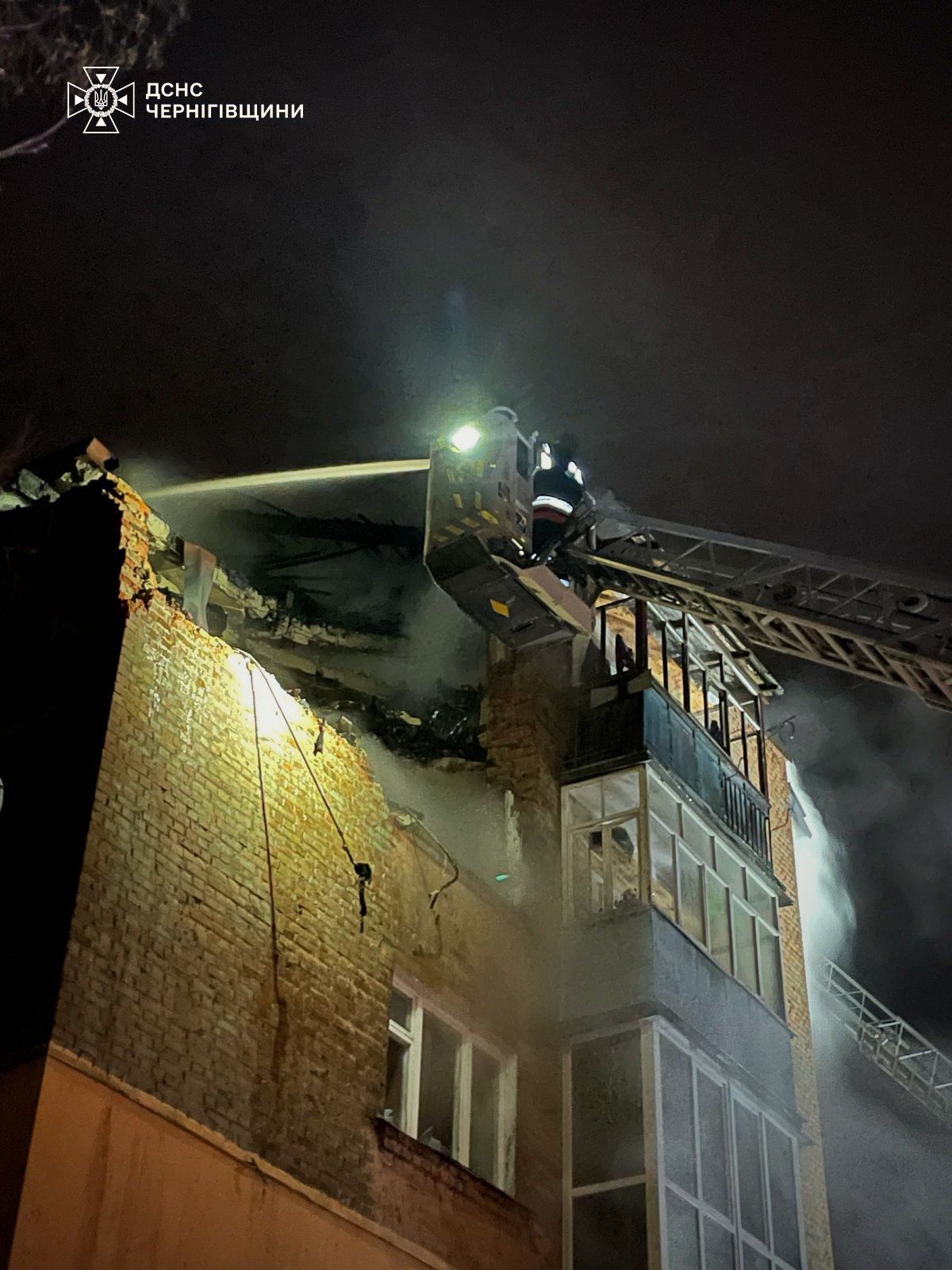 Начальник Черниговской городской военной администрации Дмитрий Брижинский подтвердил, что в городе взорвался вражеский БПЛА. Вражеский дрон попал в пятиэтажное здание. На месте взрыва произошел пожар. Частично разрушены 2 этажа. Спасатели добрались до двух заваленных квартир. Пострадавшие не обнаружены. Эвакуирована пожилая женщина.