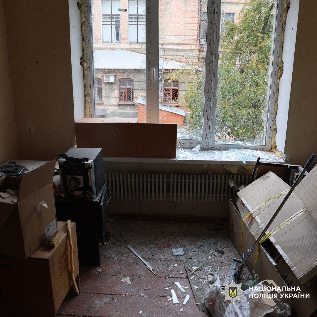Глава Харьковской ОВА Олег Синегубов сообщил, что в здании выбиты окна и повреждена крыша. Также пострадали два автомобиля. На месте работали подразделения ГСЧС и полиция.