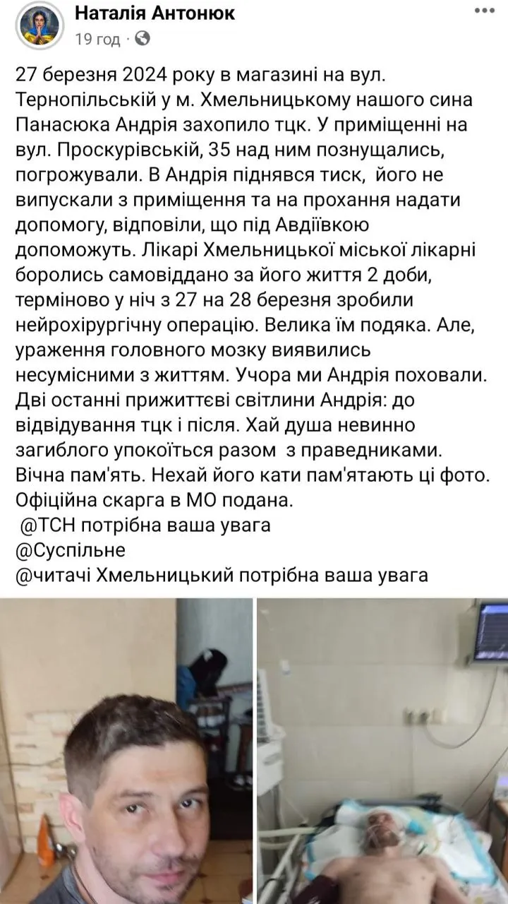 В то же время в сети распространяется сообщение жительницы Хмельницкого Натальи Антонюк, которая обвиняет в смерти своего сына ТЦК и ВВК. По ее словам, Андрея Панасюка – ее сына, 27 марта забрали в местный ТЦК. Женщина заявляет, что с ее сына там якобы издевались, после чего у того поднялось давление.