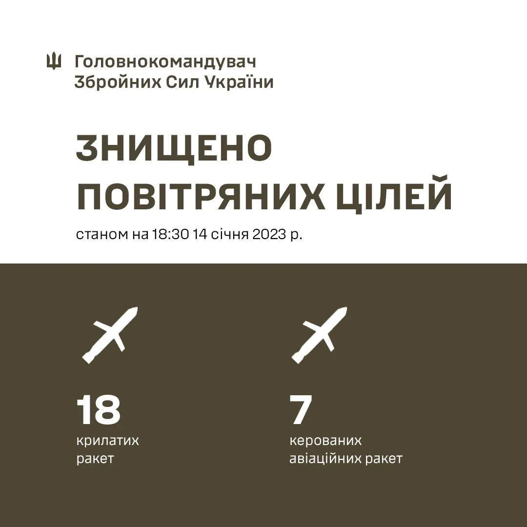 Силами и средствами Воздушных Сил Вооруженных Сил Украины во взаимодействии с подразделениями других составляющих Сил обороны уничтожено 18 крылатых ракет и 7 управляемых авиационных ракет.