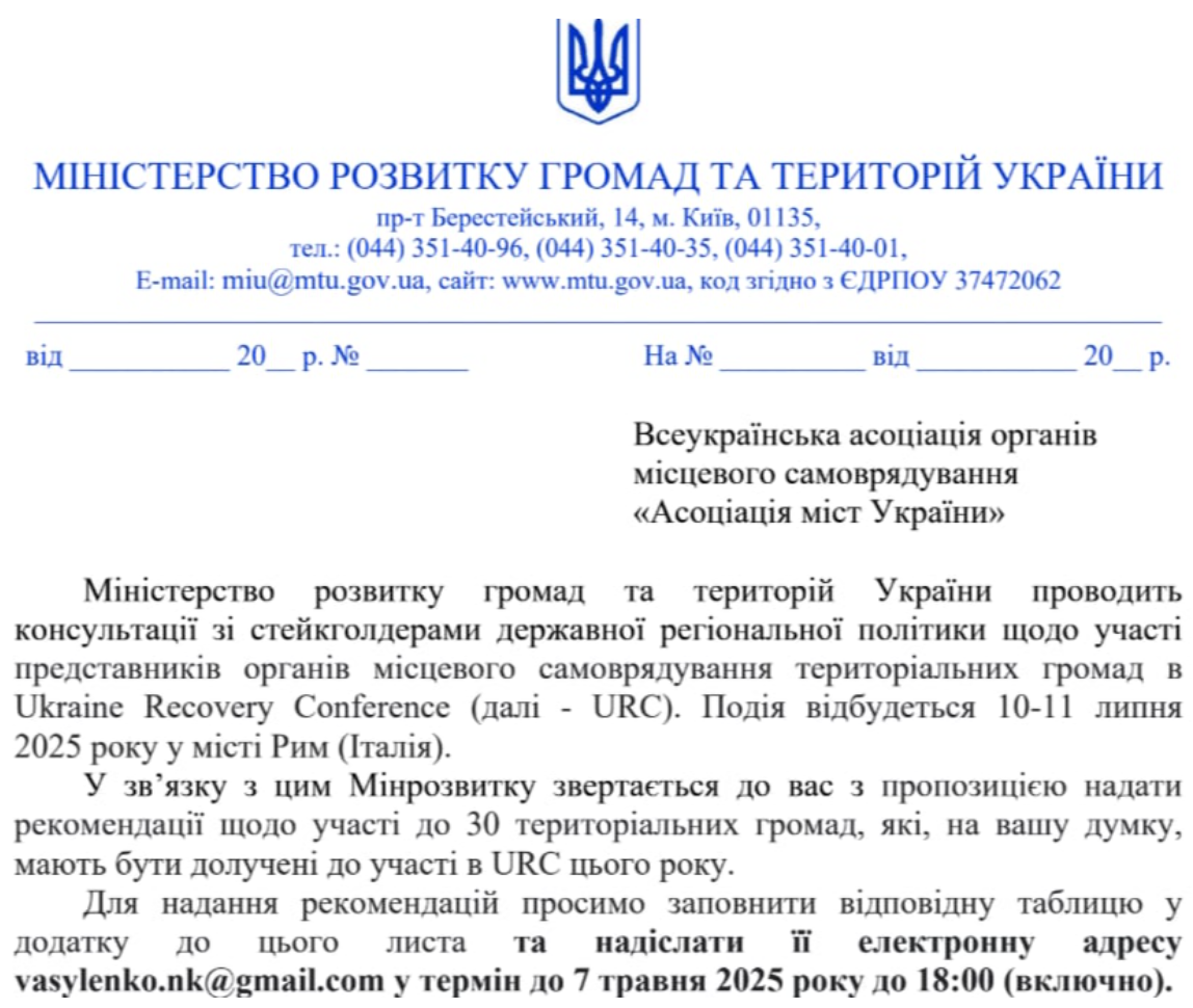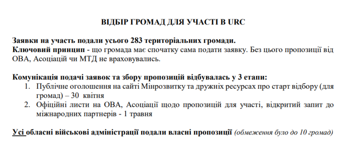 Информация об отборе громад для участия в URC, которую направил Минрегион / Скриншот автора