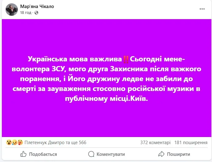 Волонтер Марьяна Чикало заявила, что в Киеве во время отдыха произошел конфликт. По ее словам, она вместе с друзьями (волонтерами и военными) отдыхала в Голосеево в одной из беседок.