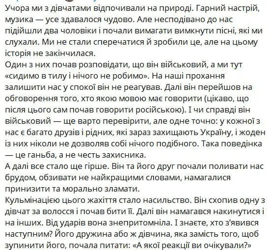 В соседней беседке звучала русская музыка, поэтому компания волонтера сделала замечание. После нескольких часов ситуация повторилась, поэтому военный из компании волонтера снова попросил выключить музыку. Впрочем, начался конфликт между компаниями.