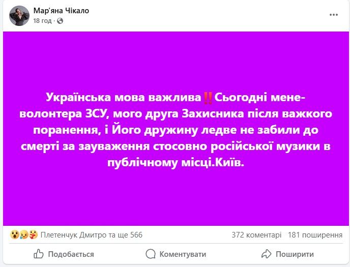 Подобный инцидент ранее произошел на Прикарпатье. Там женщина набросилась на посетительницу кафе из-за просьбы выключить русскую музыку