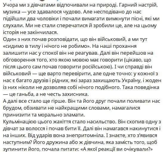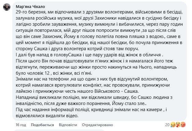 Волонтер Марьяна Чикало заявила, что в Киеве во время отдыха произошел конфликт. По ее словам, она вместе с друзьями (волонтерами и военными) отдыхала в Голосеево в одной из беседок.