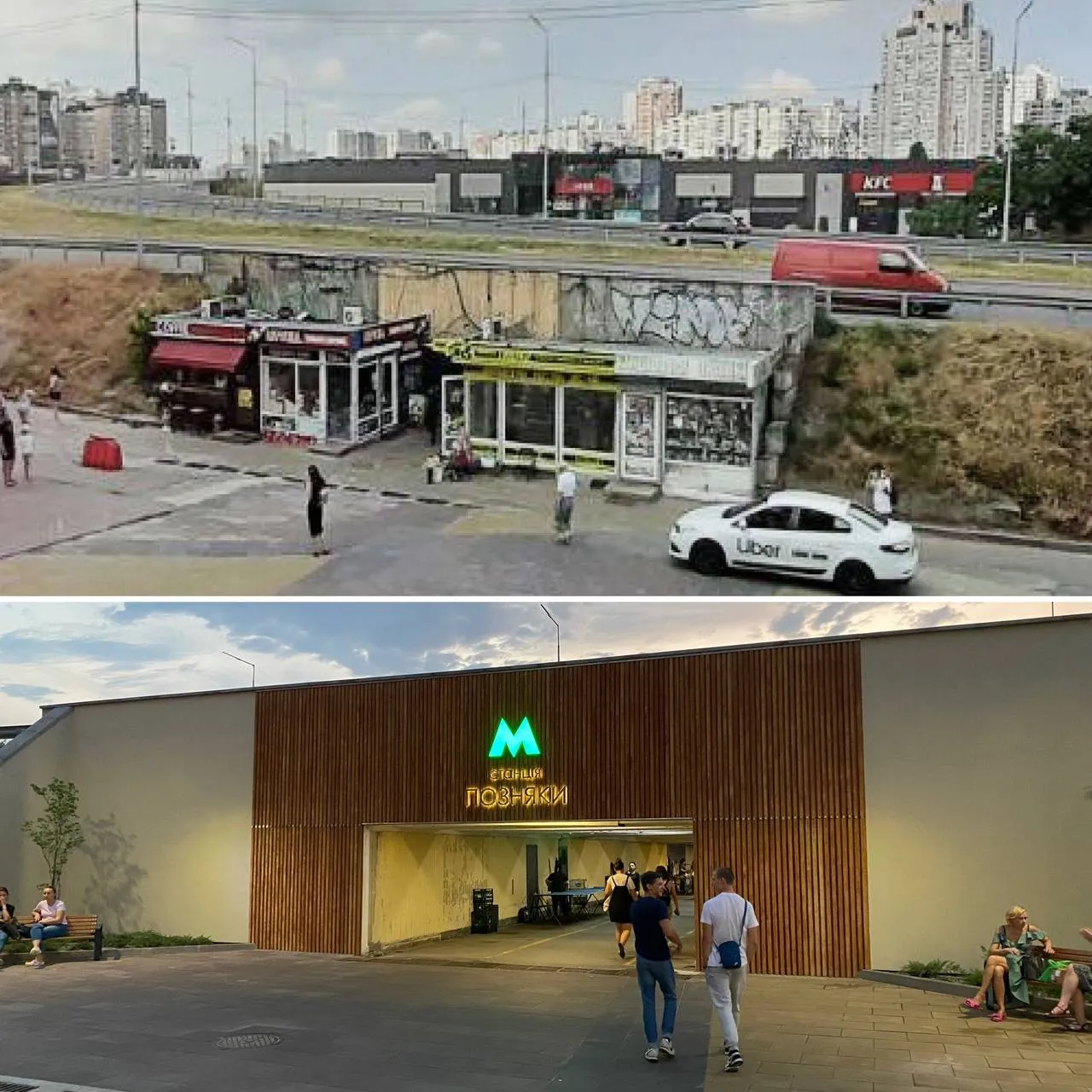 Теперь вместо обнесенного киосками выхода со станции метро на проспект Николая Бажана видно красивый фасад с небольшой зоной отдыха. Да, обновленный выход трудно узнать.