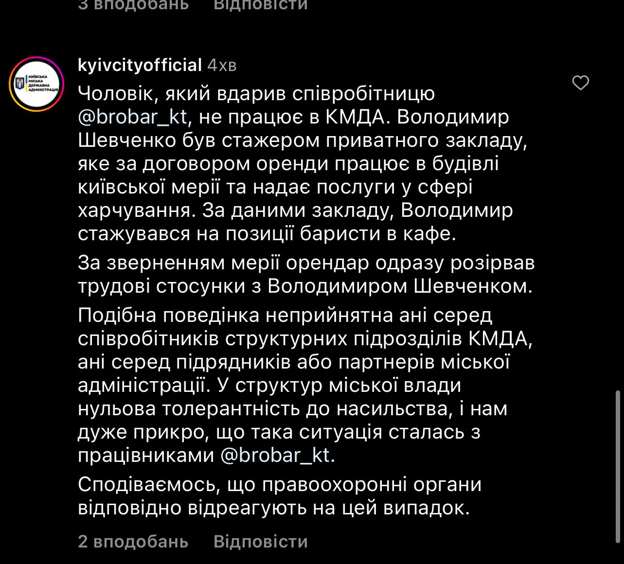 Ударившего баристу парня зовут Владислав Шевченко. В КГГА отметили, что он у них не работает и никогда не работал. Он был стажером в частном кафе, расположенном в здании мэрии.