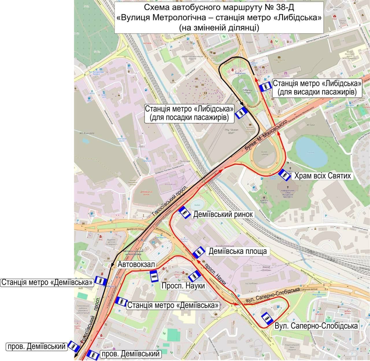 - Временный автобусный маршрут №2м "Кибернетический центр – метро "Теремки" – метро "Лыбедская". На нем будут курсировать 60 автобусов с интервалом движения 1 минута.
