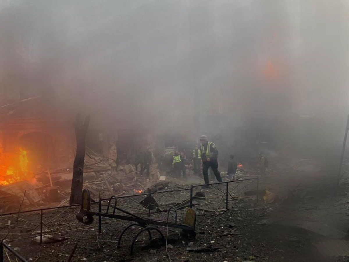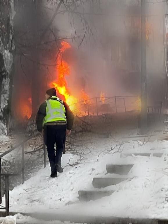 Правоохранители проводят осмотр места происшествия и фиксируют последствия попадания ракеты в многоэтажку.