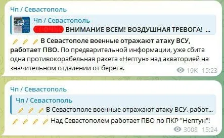 Крымские СМИ сообщают, что Украина, вероятно, атакует Севастополь противокорабельными ракетами "Нептун". По информации местных СМИ, "на значительном расстоянии от берега" российские системы ПВО уже сбили одну ракету.