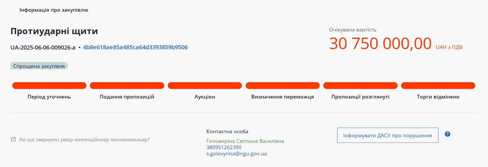 Тендер появился на платформе Prozorro в пятницу, 6 июня. Его объявленная стоимость – 30,7 миллионов гривен.