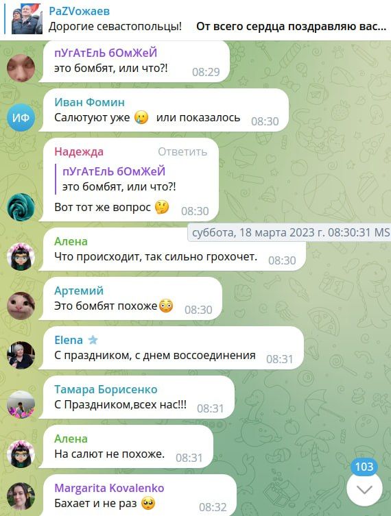 Начиная с 7:47, 18 марта в телеграм-каналах начали писать о взрывах в Севастополе. Мол, бахкает с одинаковой периодичностью. Впервые 18 марта взрывы услышали ориентировочно в 7.31.