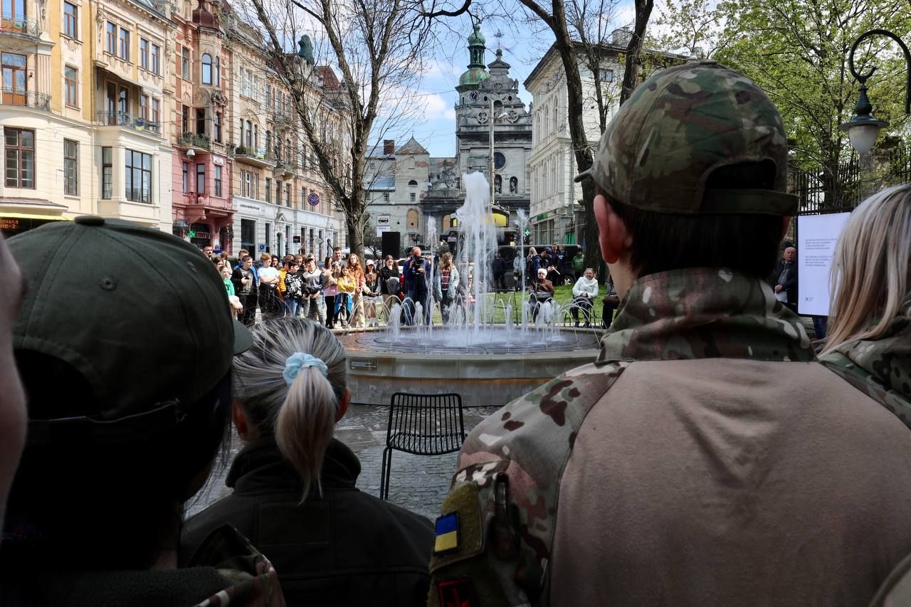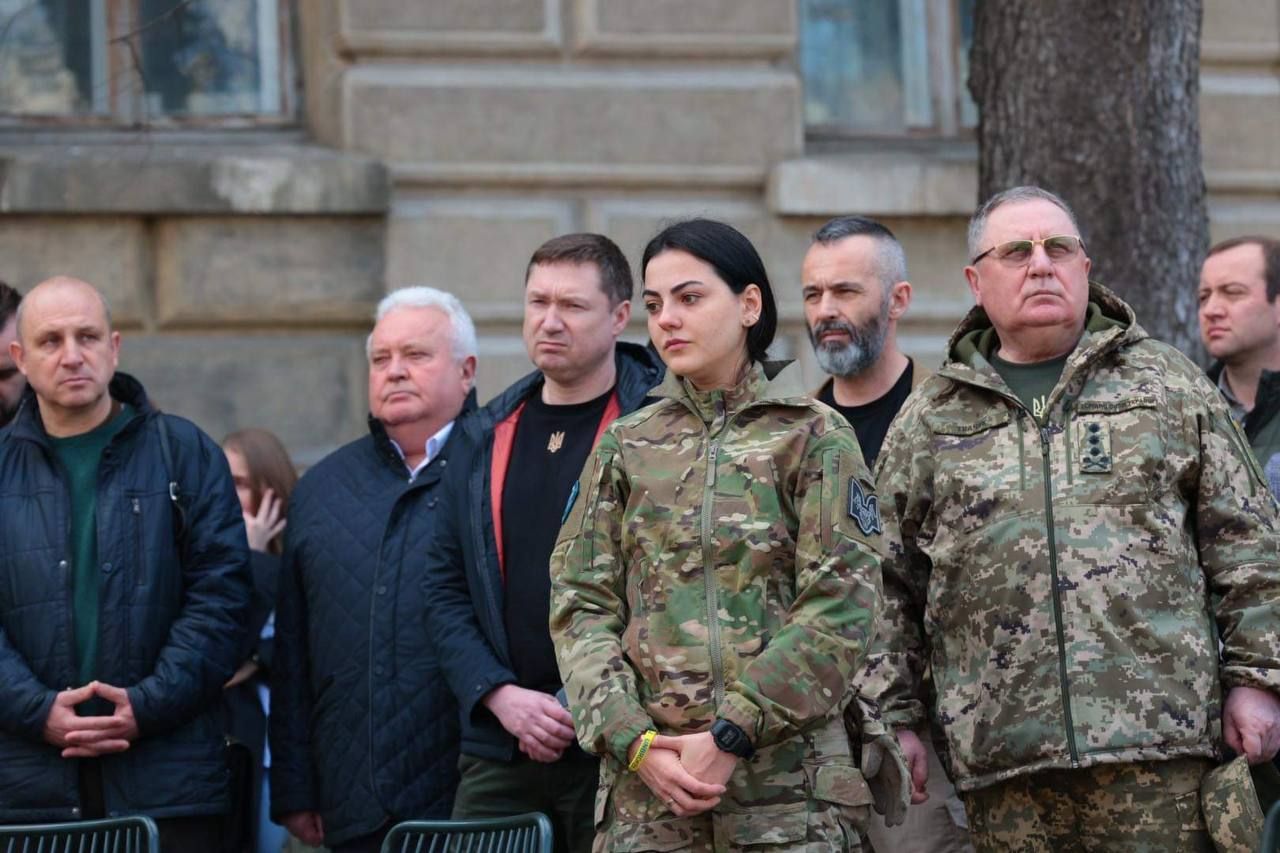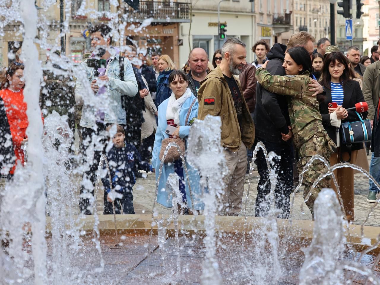 На открытии фонтана было много людей. Среди пришедших на торжественное событие были мэр города Андрей Садовый и председатель ОВА Максим Козицкий, Всеволод Кожемяко, а также невеста героя, руководительница медицинской службы "УЛЬФ" 1 ОМБ "Волки Да Винчи" Алина Михайлова.