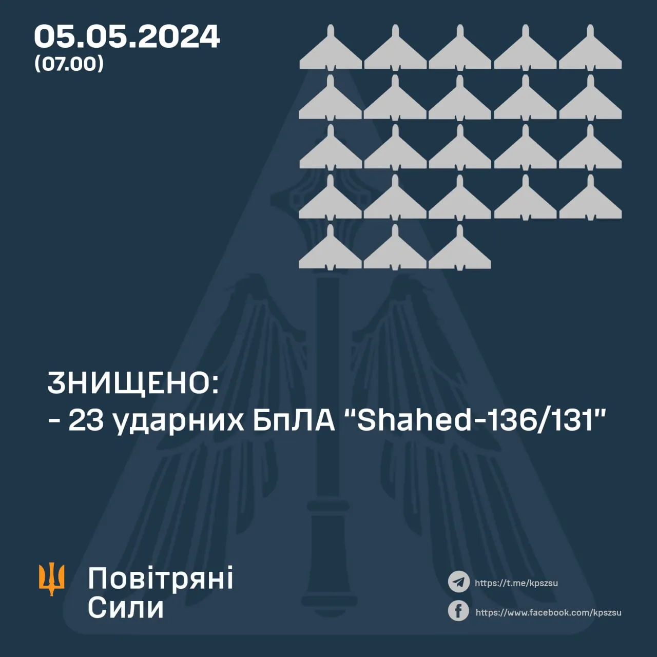 Силами и средствами противовоздушной обороны Украины 23 "Шахедов" было уничтожено. Боевая работа проводилась в нескольких областях Украины.