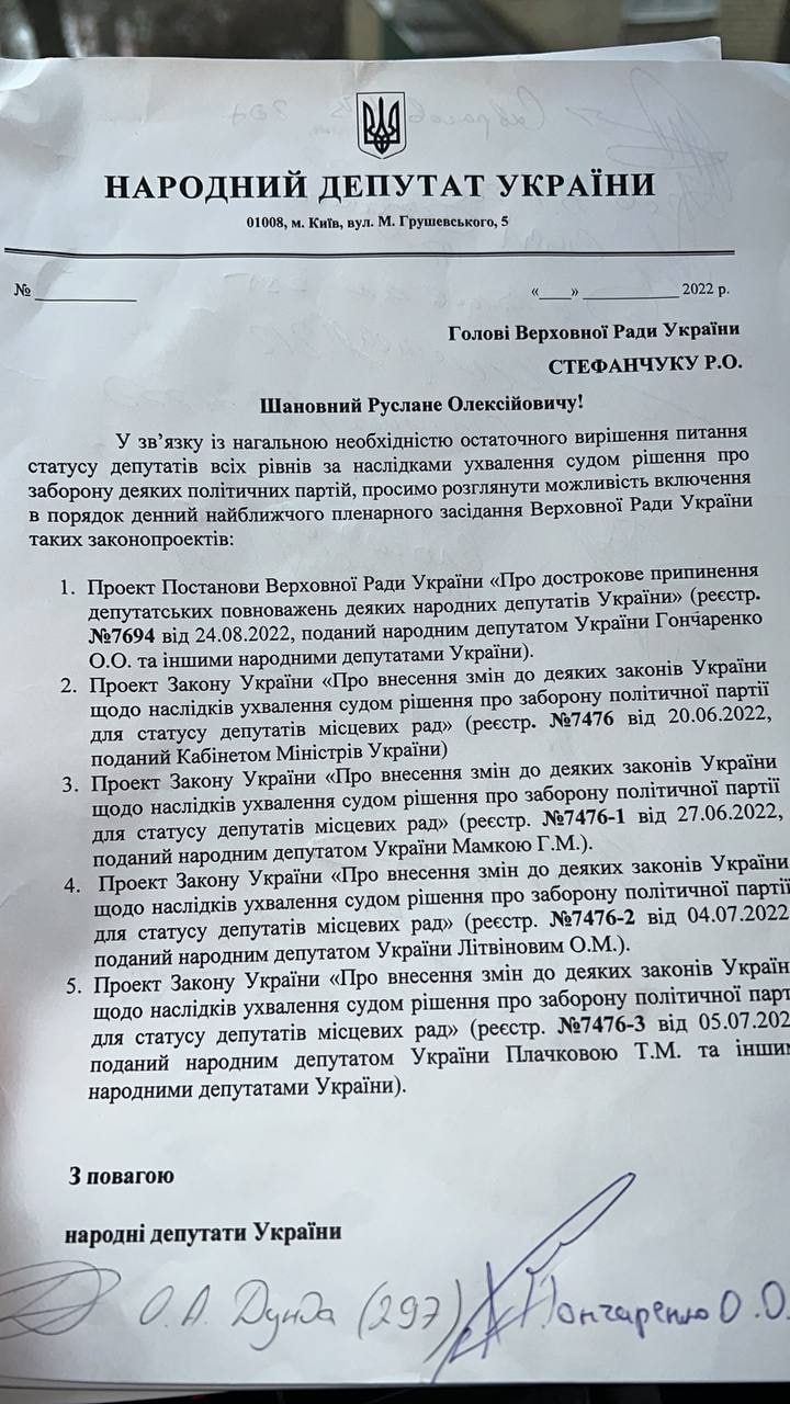Под обращением о лишении мандата представителей ОПЗЖ собрали около 50 подписей народных депутатов. Вопросы хотят вынести на повестку дня следующей сессии Верховной Рады.