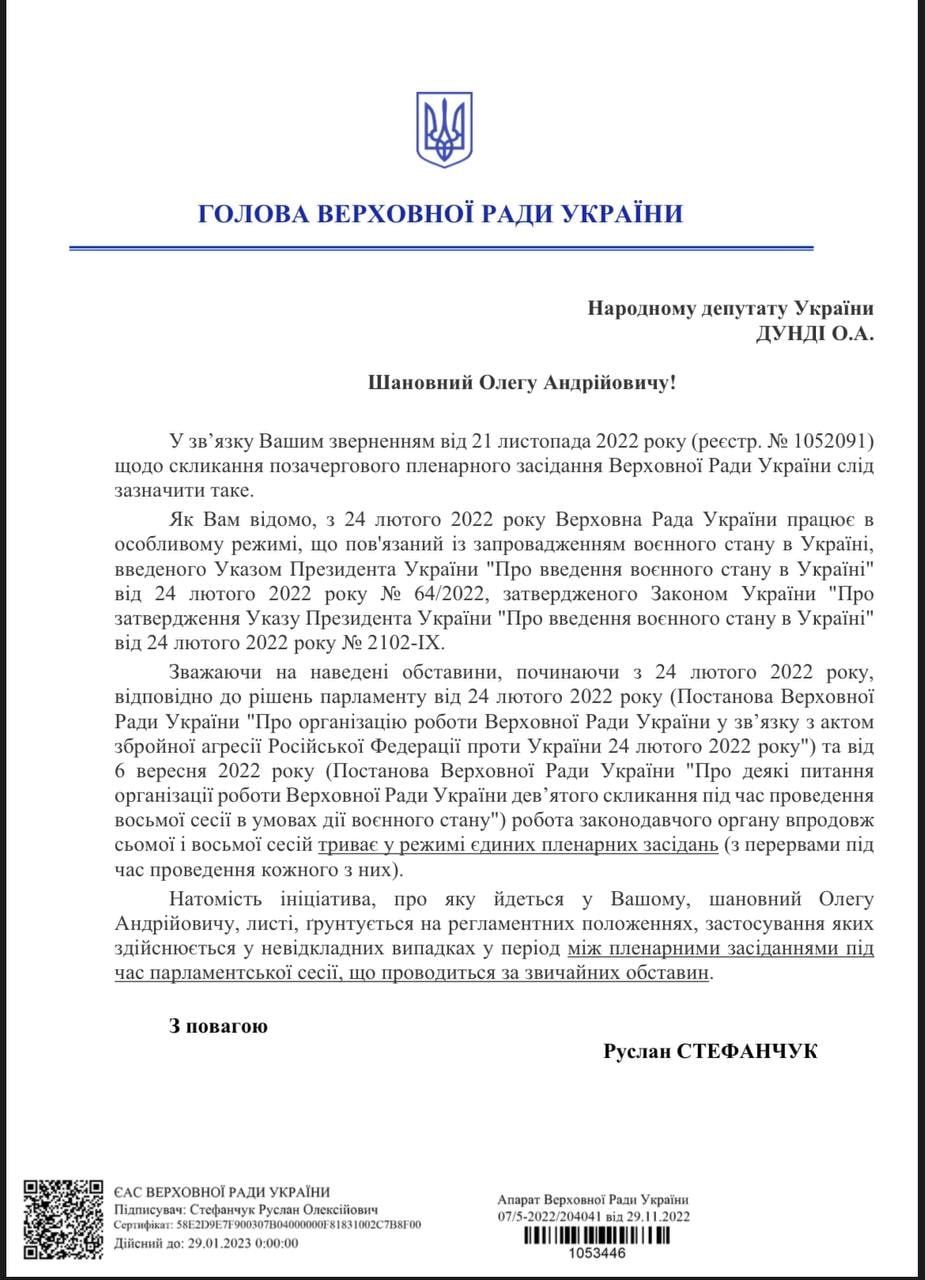Народный депутат Олег Дунда утверждает, что получил формальный отказ от спикера парламента Руслана Стефанчука. Это касается проведения внеочередной сессии для лишения мандатов депутатов всех уровней от запретных партий.
